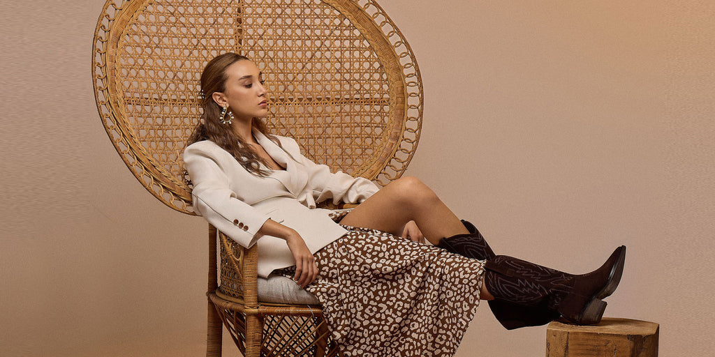 Blazer dresses, sculpted with precision and daring cutouts, channel the fearless romance of the frontier muse. Earth-toned palettes melt into fiery reds and rich neutrals, evoking the warmth of canyon sunsets. Statement boots ground the look, while woven textures and sculptural earrings nod to the raw beauty of the open plains.