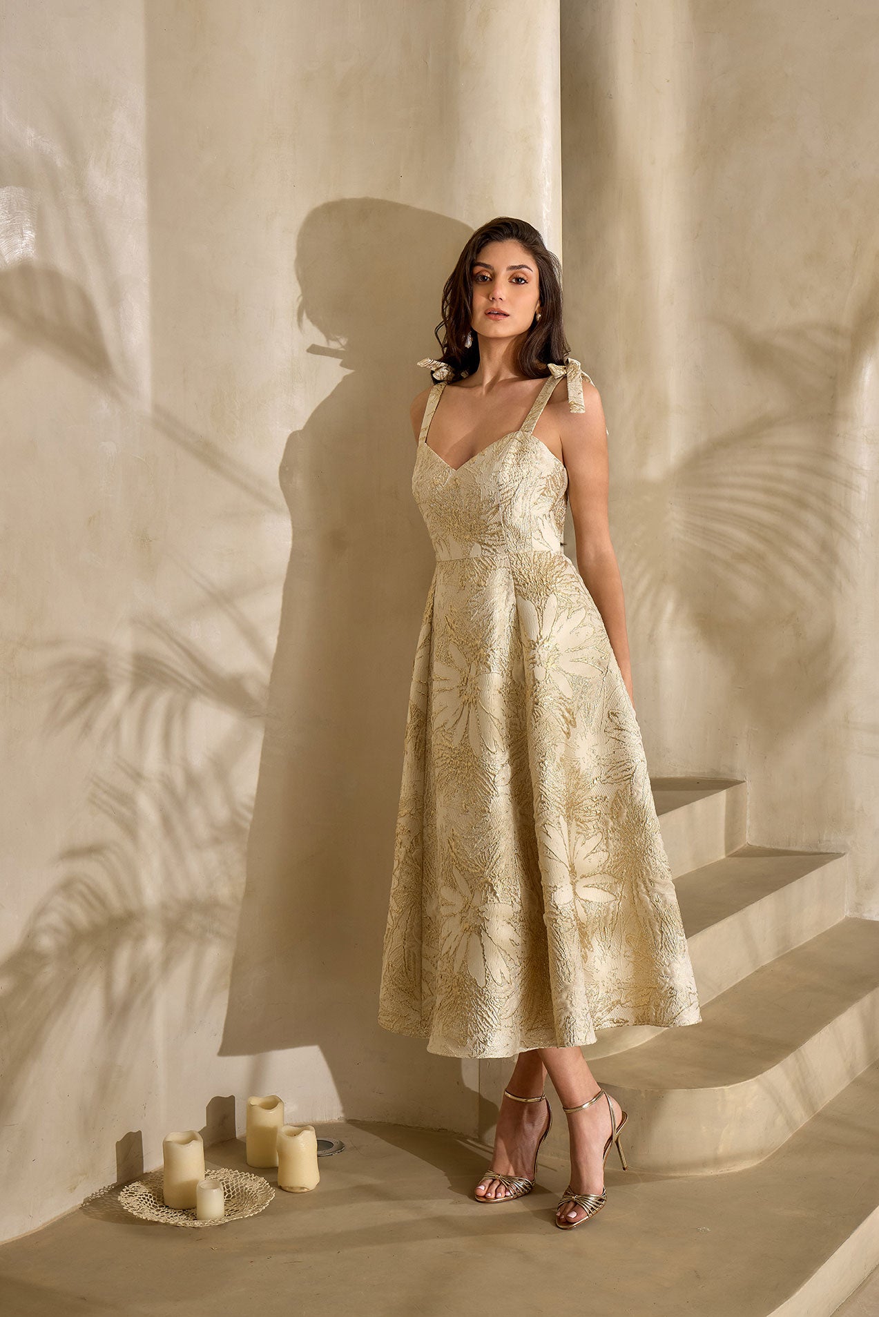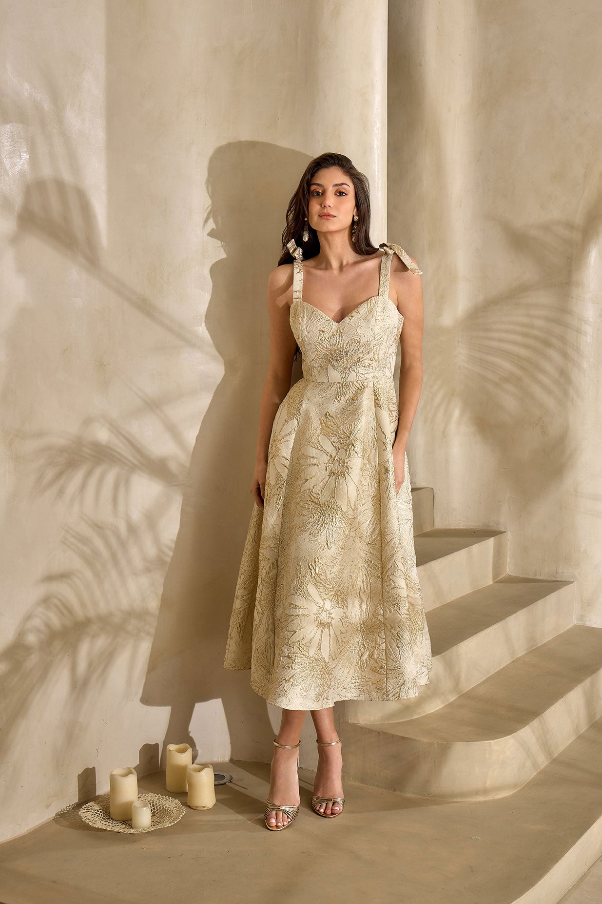Romantic and radiant, the Joella Dress captures effortless femininity with a touch of artisanal charm. Designed in a soft golden color, this dress features delicate flower pattern that brings texture and subtle brilliance to the entire silhouette.