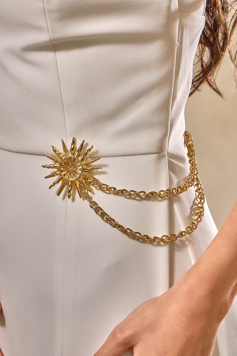 The fitted bodice flows seamlessly into a shirt skirt with a slit, elongating the figure while allowing graceful movement. Delicate sun-inspired embellishments at the waist, connected by fine chain detailing, add a signature touch of artistry and luminous charm.