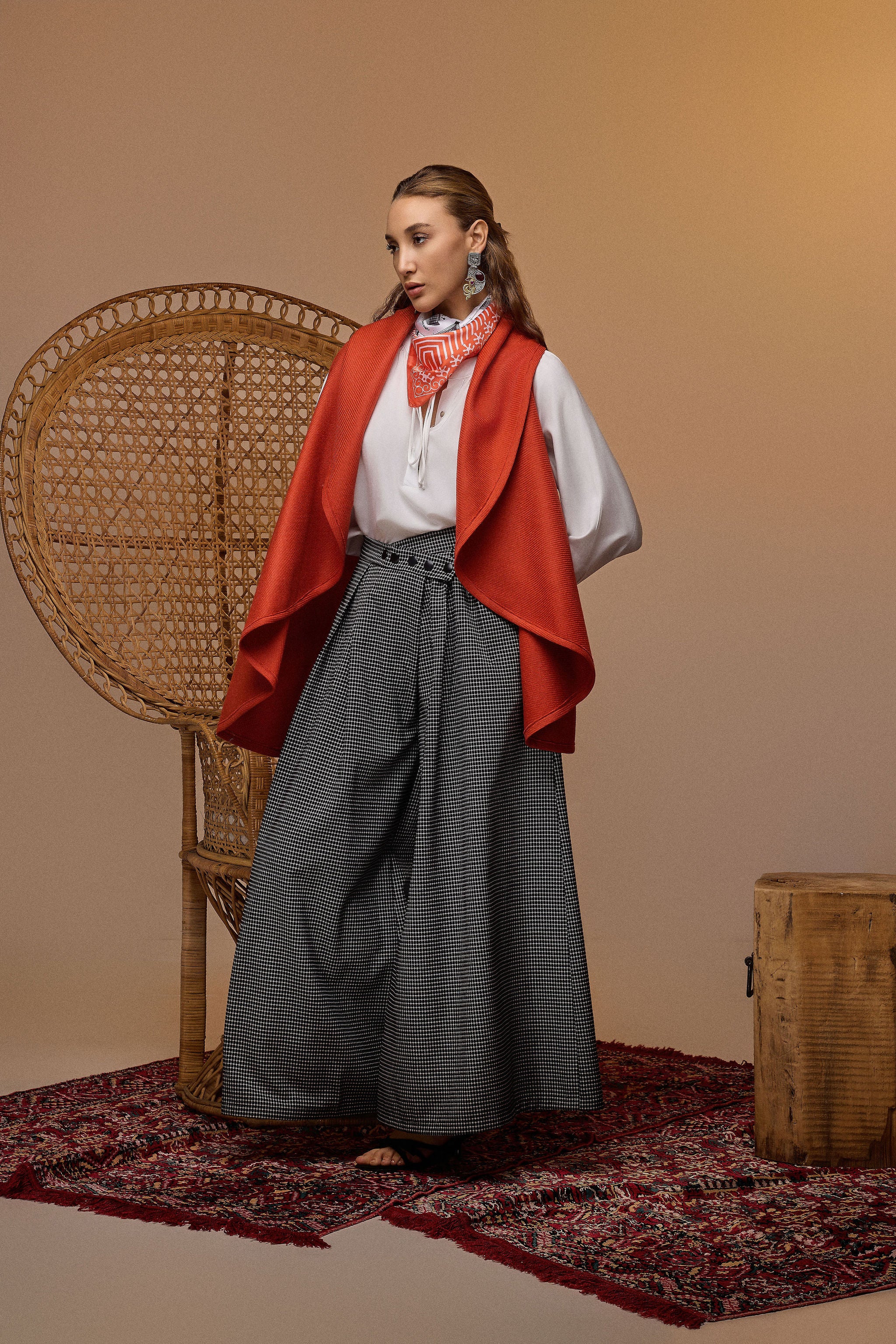 A graceful nod to vintage tailoring with a modern bohemian spirit, the Milo Pants are a poetic play in structure and fluidity. Rendered in timeless black-and-white check, these wide-leg wonders cinch at the waist with soft pleats that flow into a dramatic drape — giving the illusion of a skirt with the confidence of pants. Effortless elegance for the woman who writes her own rules.