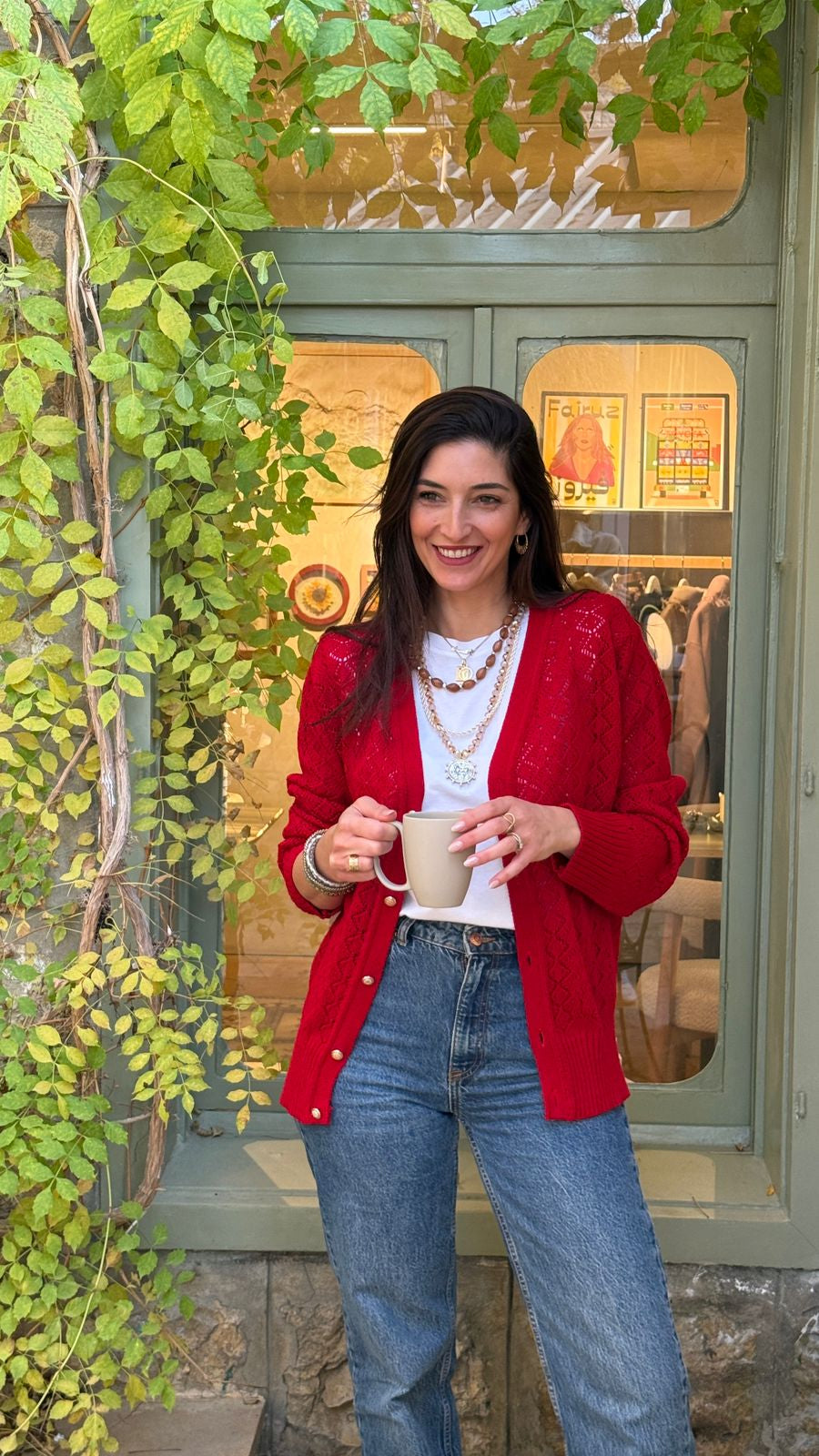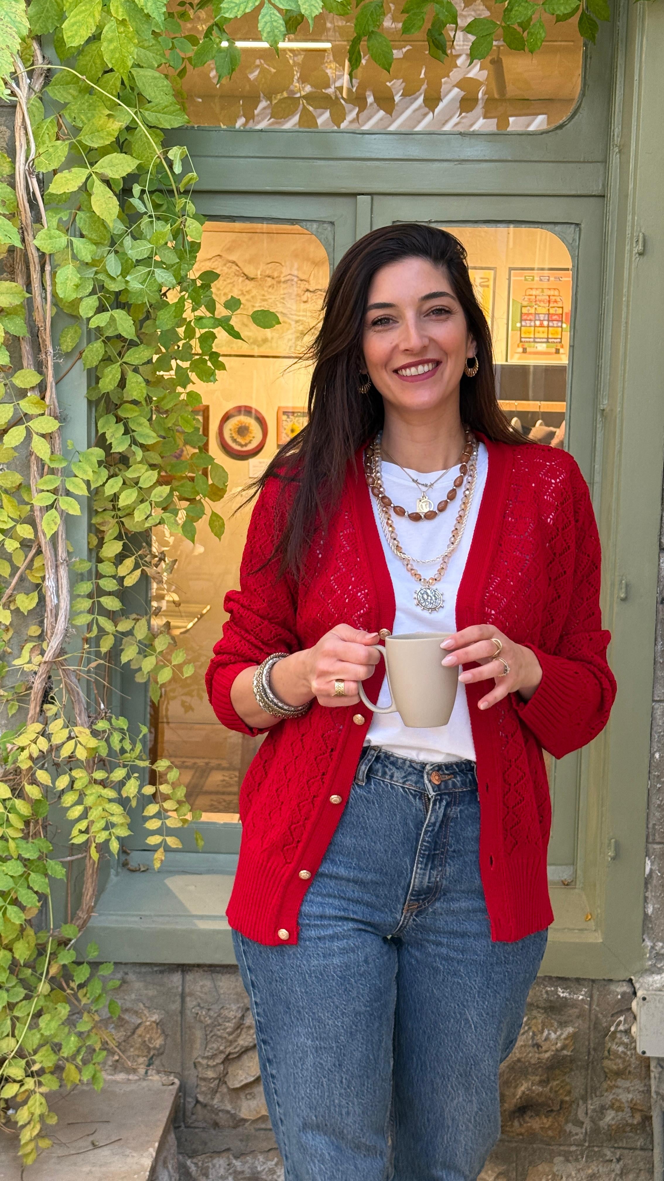 The Nina Cardigan is a classic, elevated layering piece with a timeless feel. It features an open-knit pattern that adds subtle texture while remaining lightweight and breathable. The design includes a flattering V-neckline, long sleeves with ribbed cuffs, and a ribbed hem for a polished finish. Sophisticated buttons down the front add a touch of understated elegance. Easy to dress up or down, this cardigan pairs effortlessly with a simple tee and denim for a relaxed yet refined everyday look.