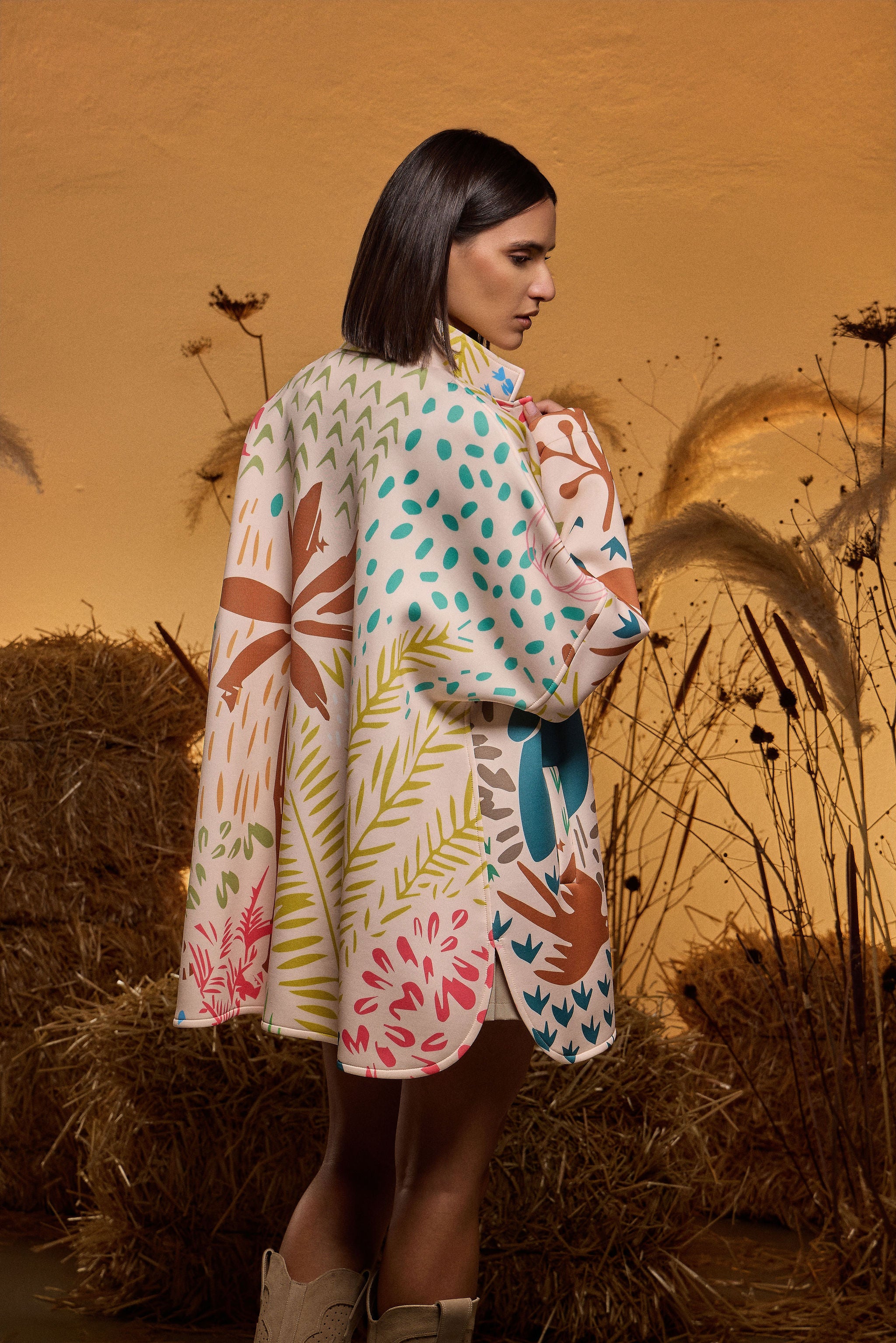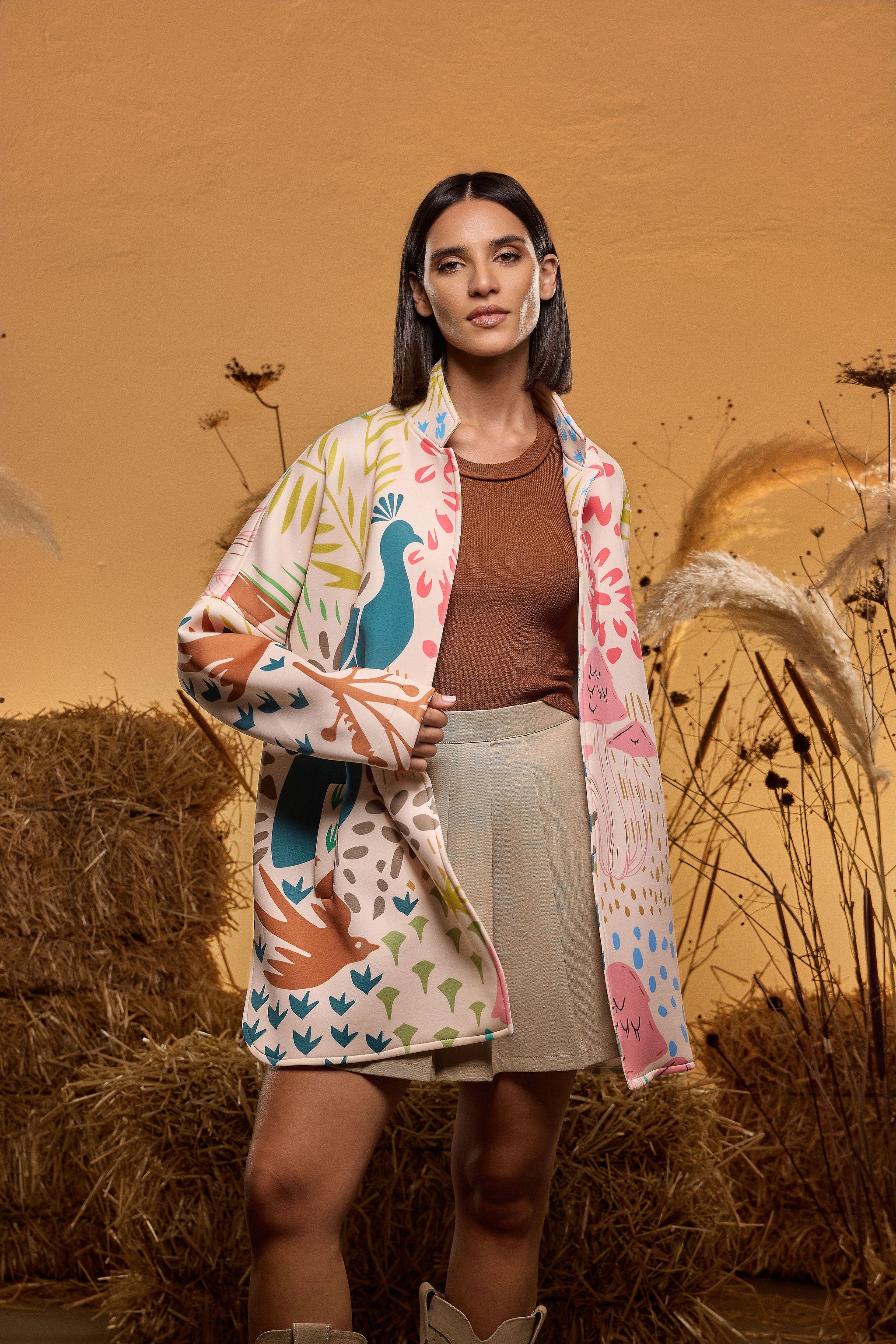 A vivid mirage of color and calm, the Oasis Jacket is a wearable daydream painted in strokes of whimsy. Its silky surface becomes a canvas of hand-drawn botanicals, dreamy fauna, and playful textures that feel plucked from an artist’s journal. Cinched gently at the waist with a matching belt, its structure is soft yet commanding — like a secret garden in bloom after rain.