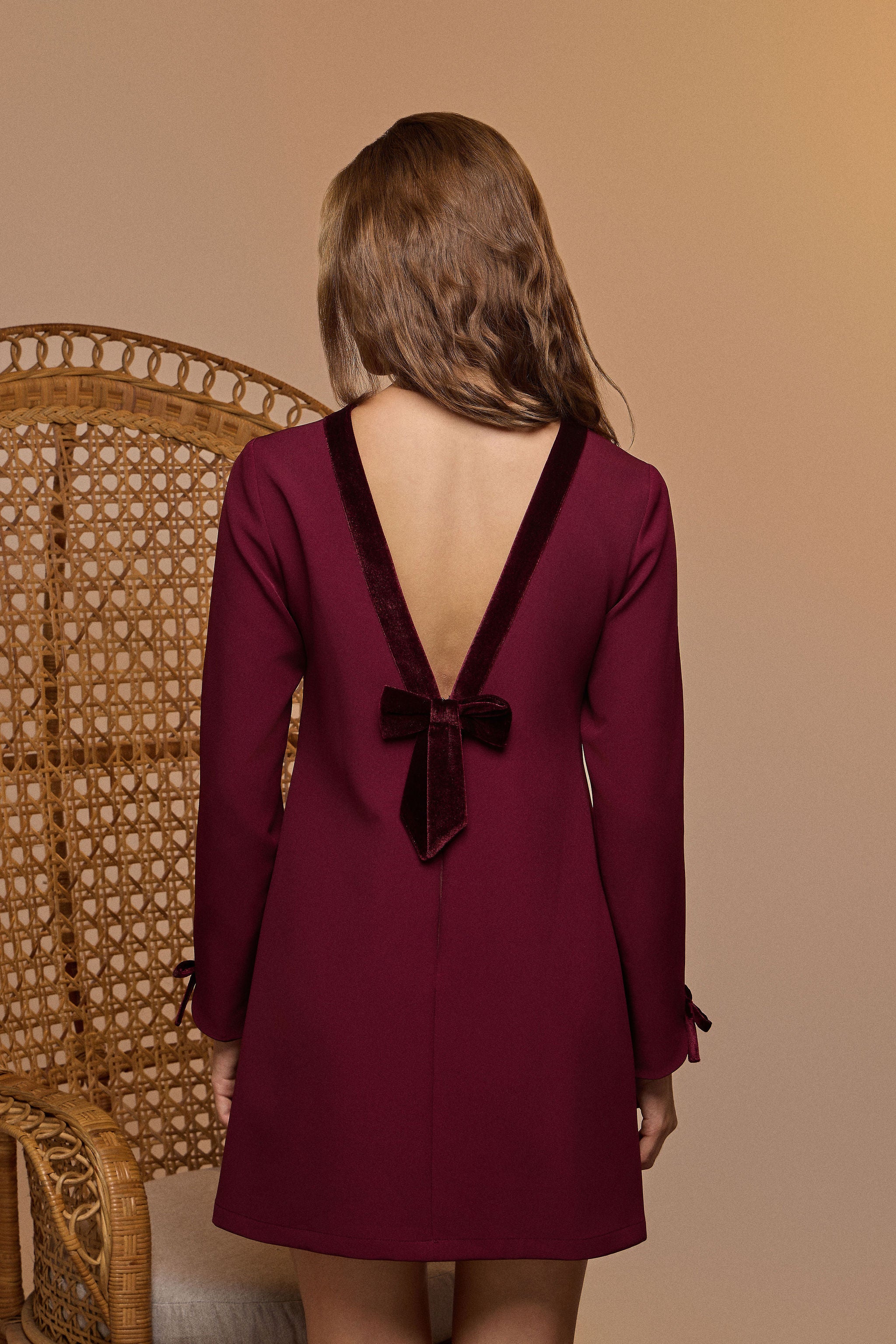 A jewel in motion, the Lillian Dress is the embodiment of modern romance with a retro soul. Rendered in a rich garnet hue, this mini dress features a clean A-line silhouette that dances playfully between mod charm and timeless femininity. Velvet-trimmed details—at the rounded neckline, statement pockets, and an irresistible deep V back—elevate the design with tactile luxury. A sculpted velvet bow rests delicately at the spine, a final flourish of softness and seduction.