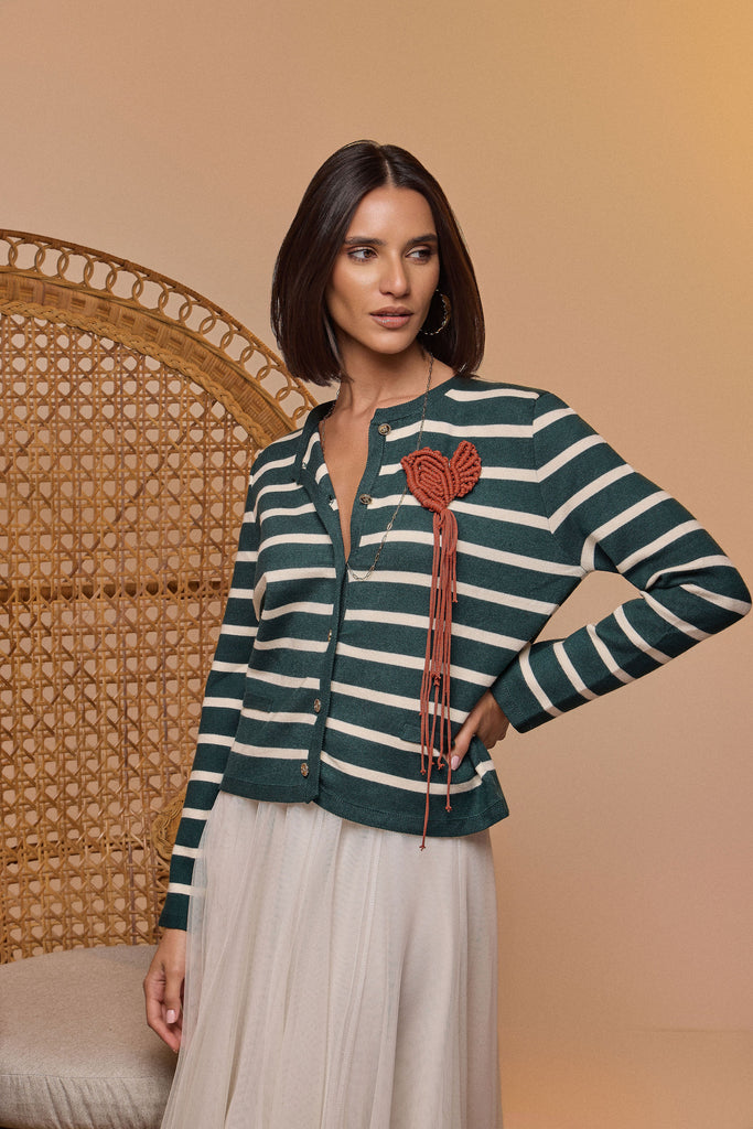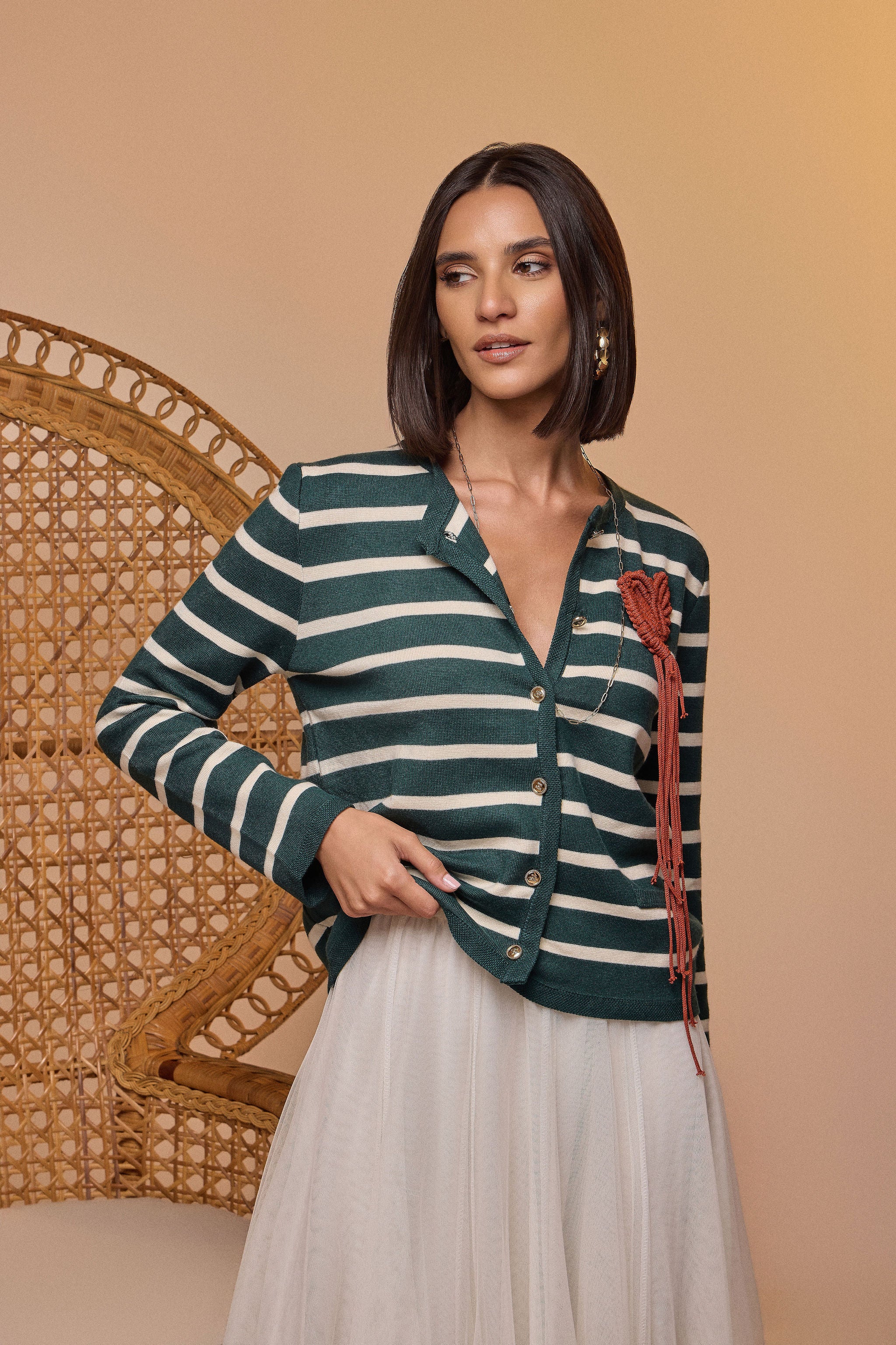 Sail into softer days with the Marinette Cardigan, a reimagined nautical classic for the modern romantic. Emerald green and cream stripes ripple across the soft knit like seafoam over deep water, while the silhouette remains timeless and cropped to perfection.