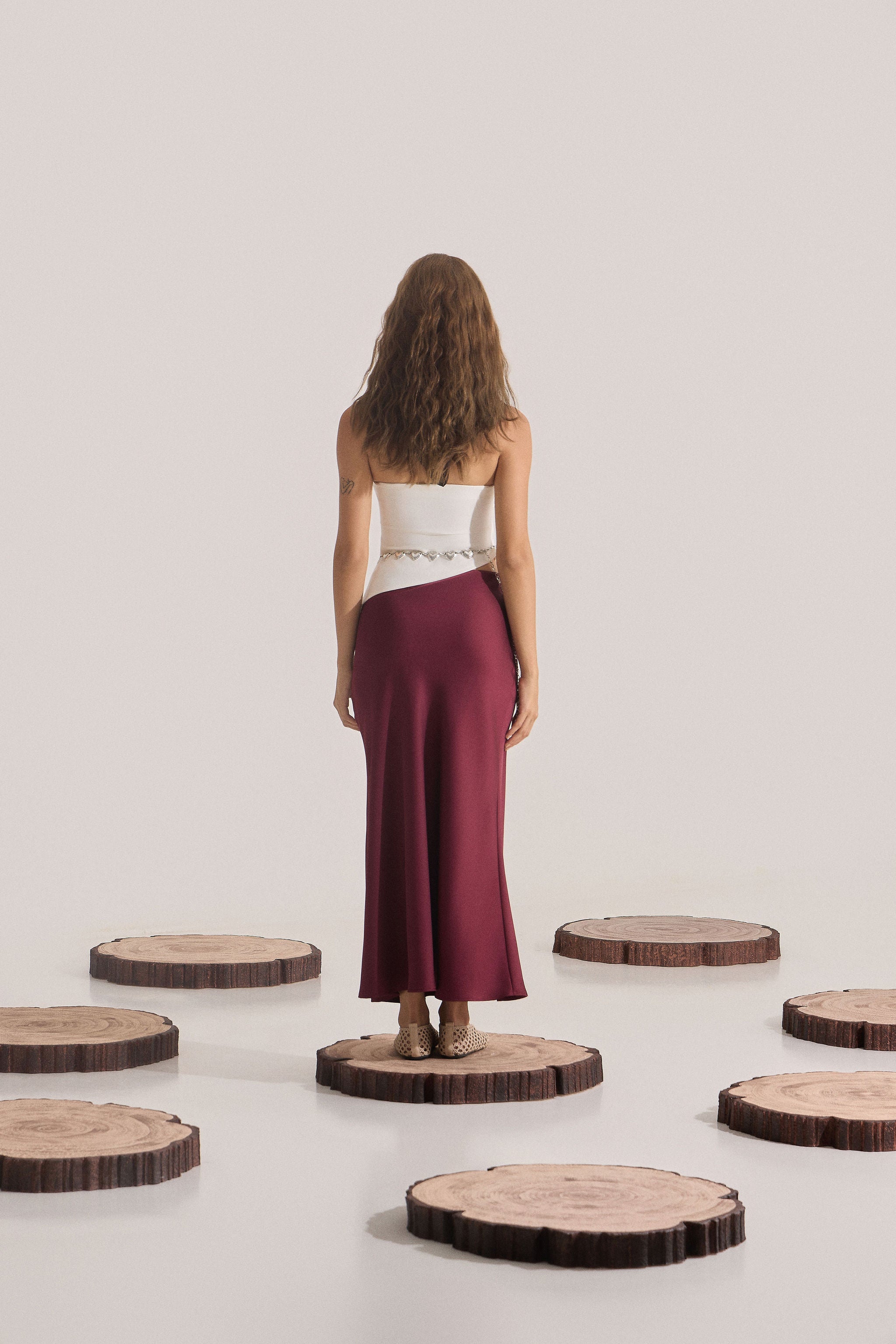 A dream cast in ivory, this satin skirt drapes like a sigh of twilight over the skin. Effortlessly elegant, it glides from a cinched waist into a fluid A-line silhouette, catching the light with every quiet movement like a petal caught in a soft breeze. The minimalist design lets its sumptuous sheen speak volumes—serene, refined, and infinitely timeless.
