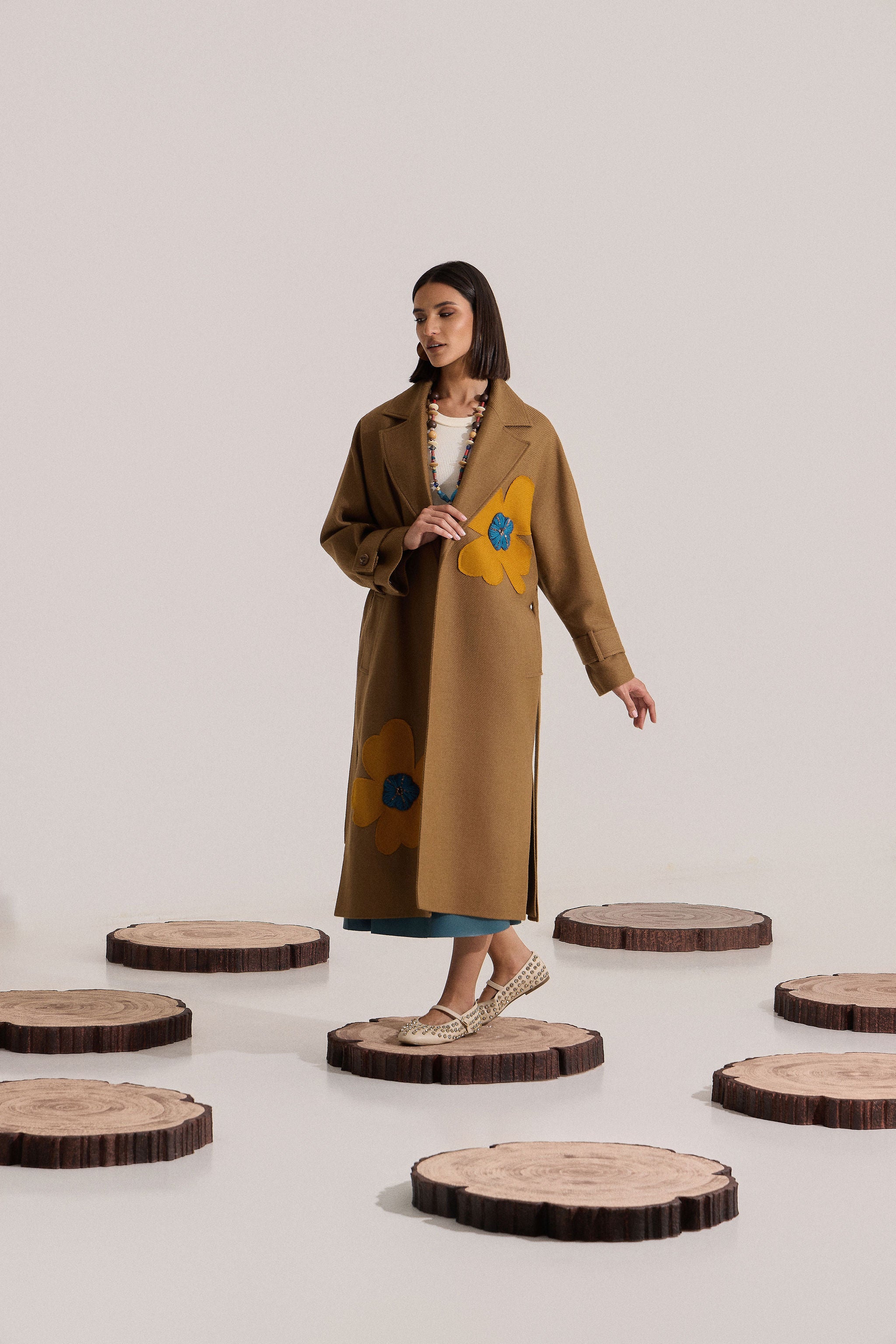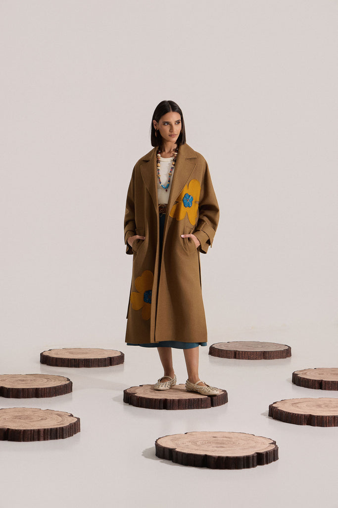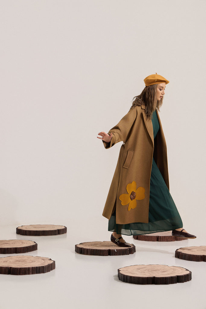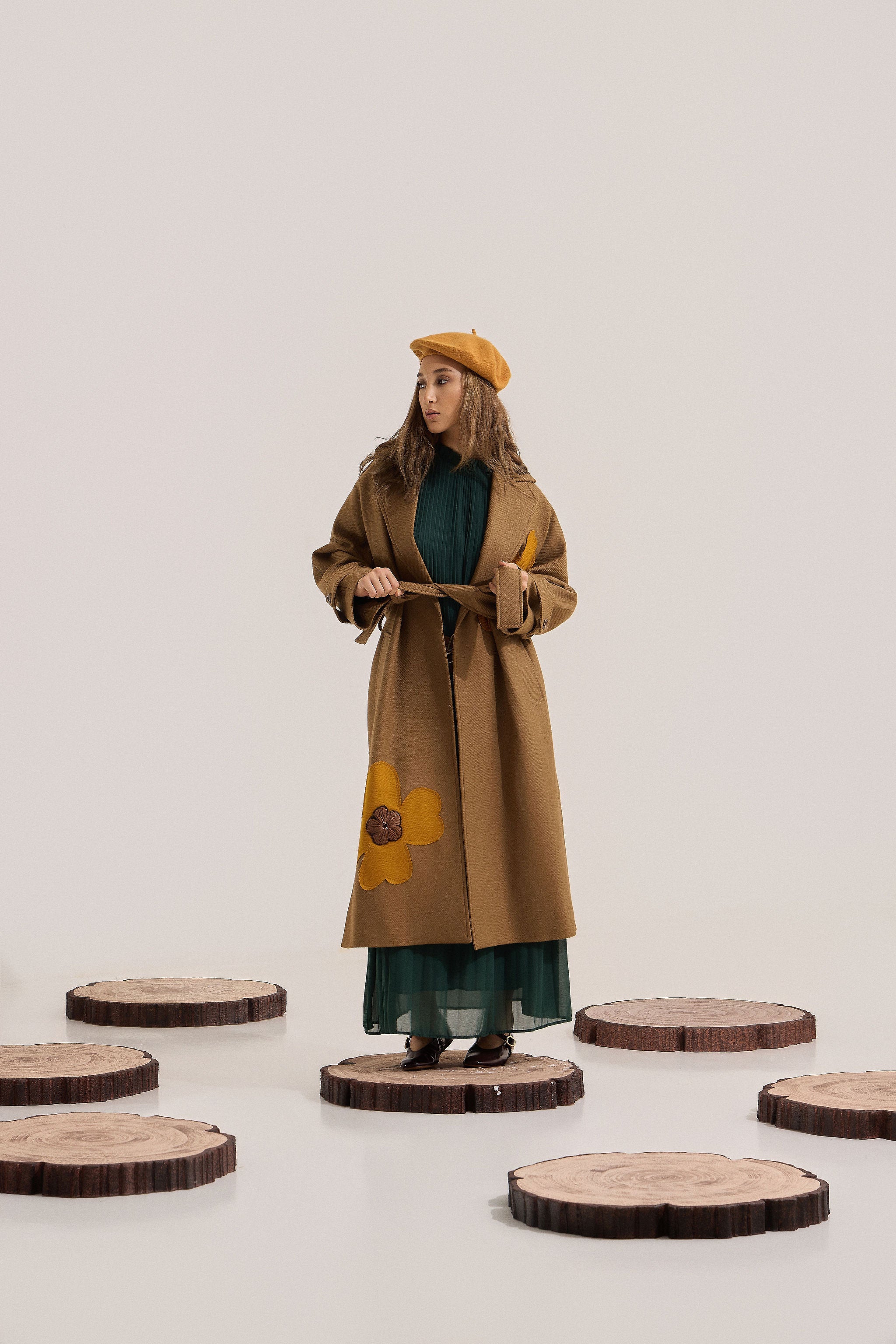 A burst of joy stitched in wool, the Valey Coat is a radiant ode to playful sophistication. Drenched in a deep tangerine hue, this oversized wrap coat turns heads with its bold floral appliqués—sunny marigold blossoms adorned with jeweled burgundy centers, blooming like a midwinter fantasy. Its dropped shoulders and relaxed tailoring evoke ease and comfort, while the sculptural flowers add a dash of irreverent charm.