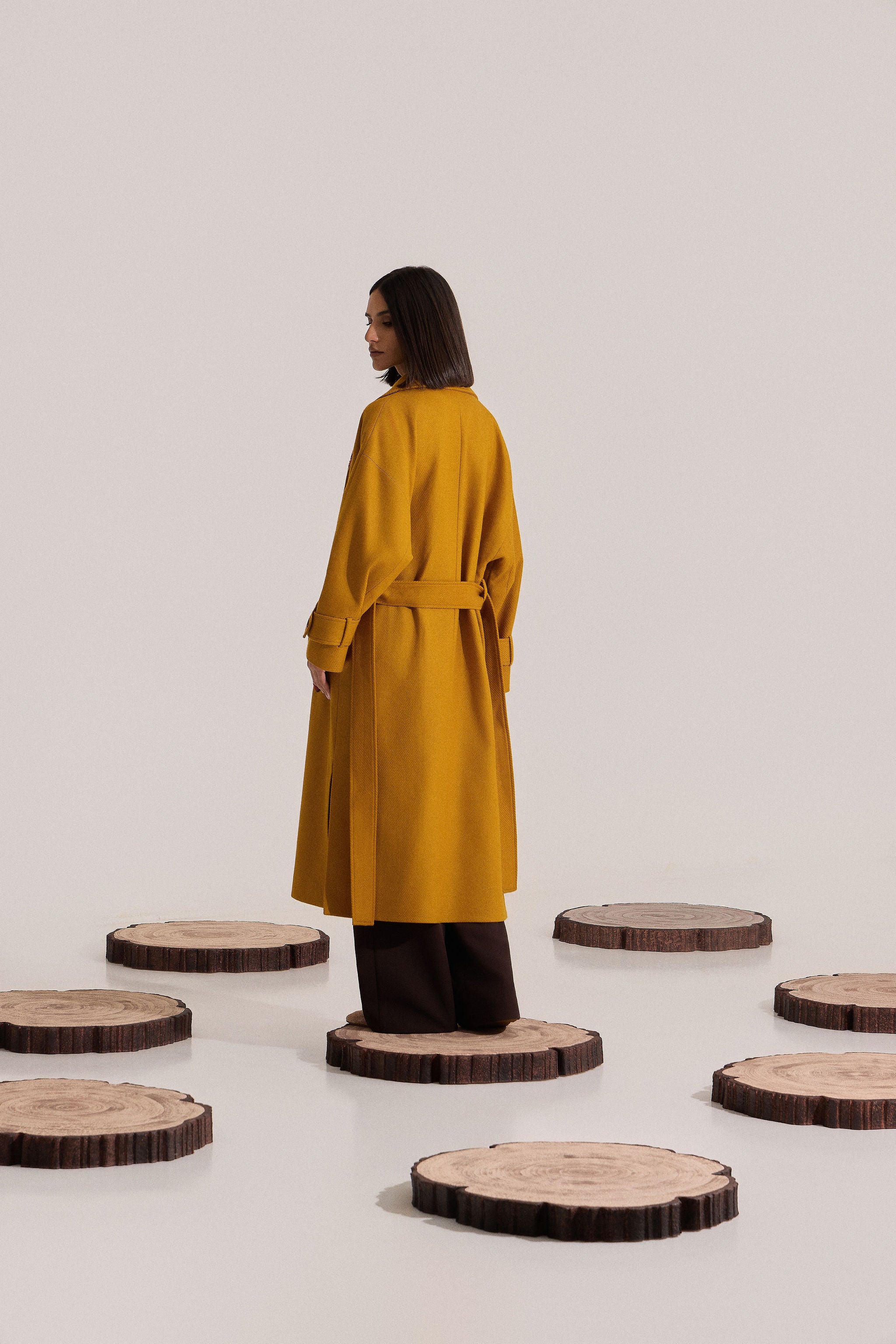 A burst of joy stitched in wool, the Valey Coat is a radiant ode to playful sophistication. Drenched in a deep tangerine hue, this oversized wrap coat turns heads with its bold floral appliqués—sunny marigold blossoms adorned with jeweled burgundy centers, blooming like a midwinter fantasy. Its dropped shoulders and relaxed tailoring evoke ease and comfort, while the sculptural flowers add a dash of irreverent charm.