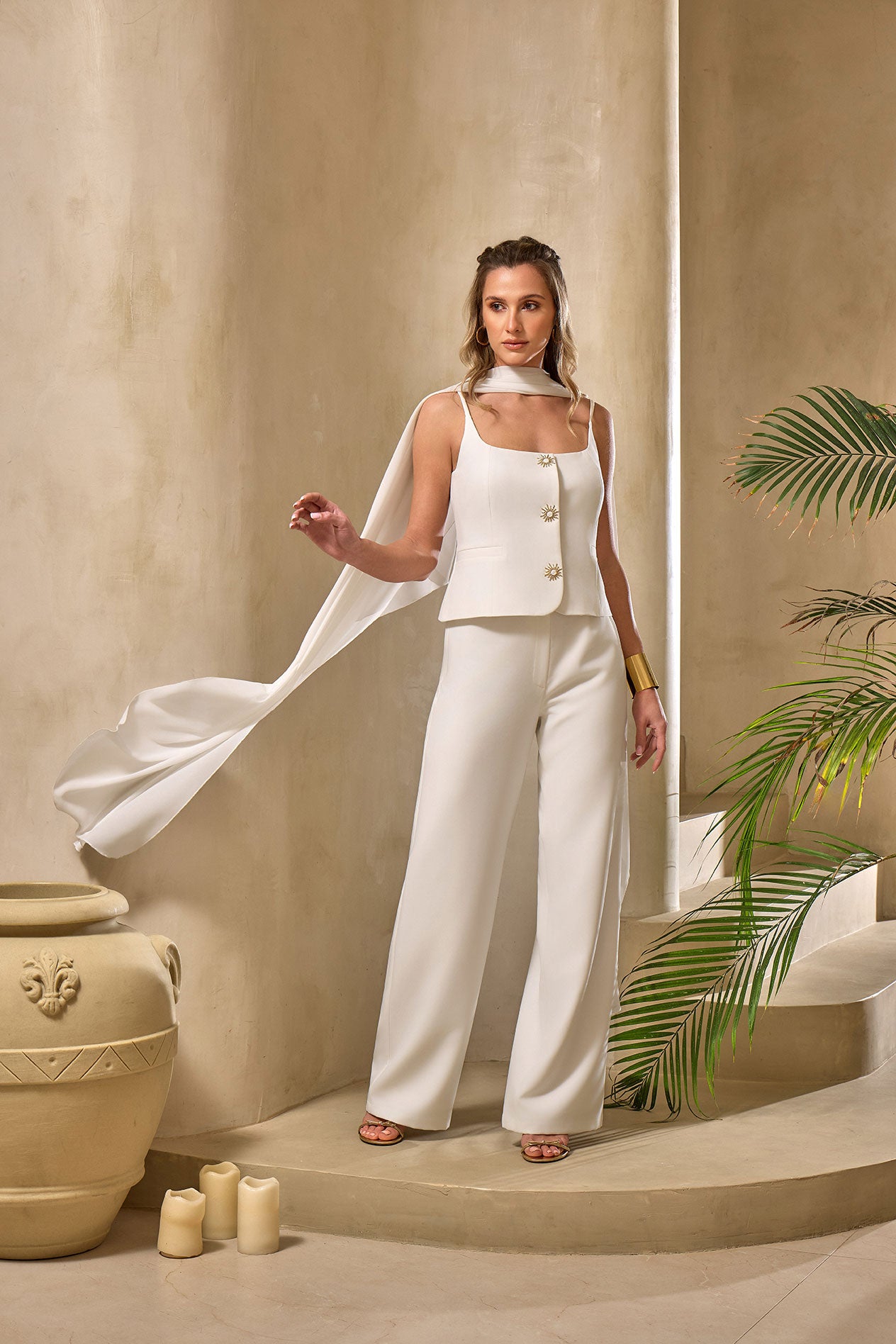 The Eve Gilet is a modern essential defined by clean lines and refined structure. Designed in a soft white tone, it features a sleek, sleeveless cut with a flattering fit that contours the body effortlessly.