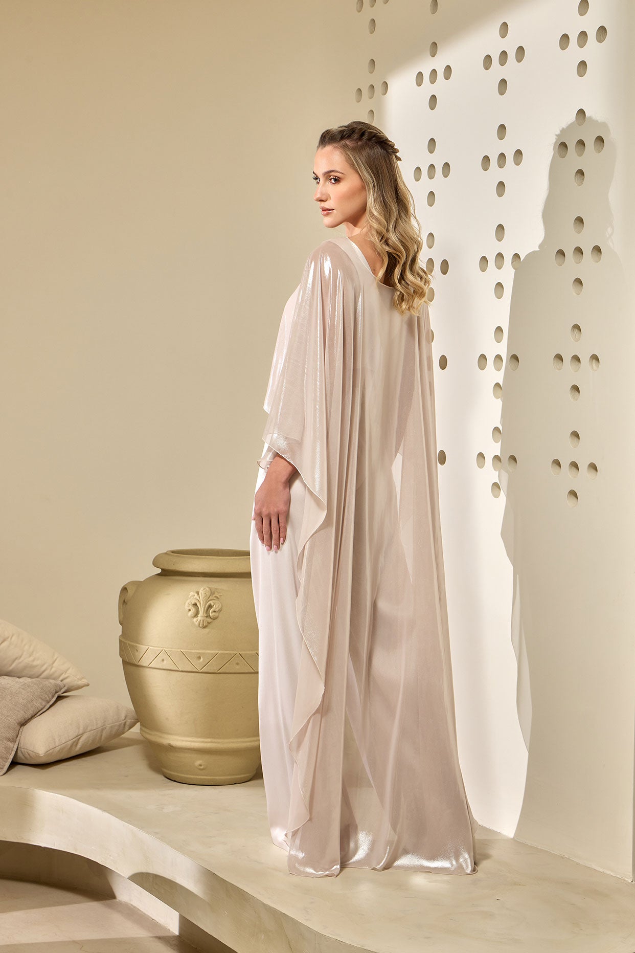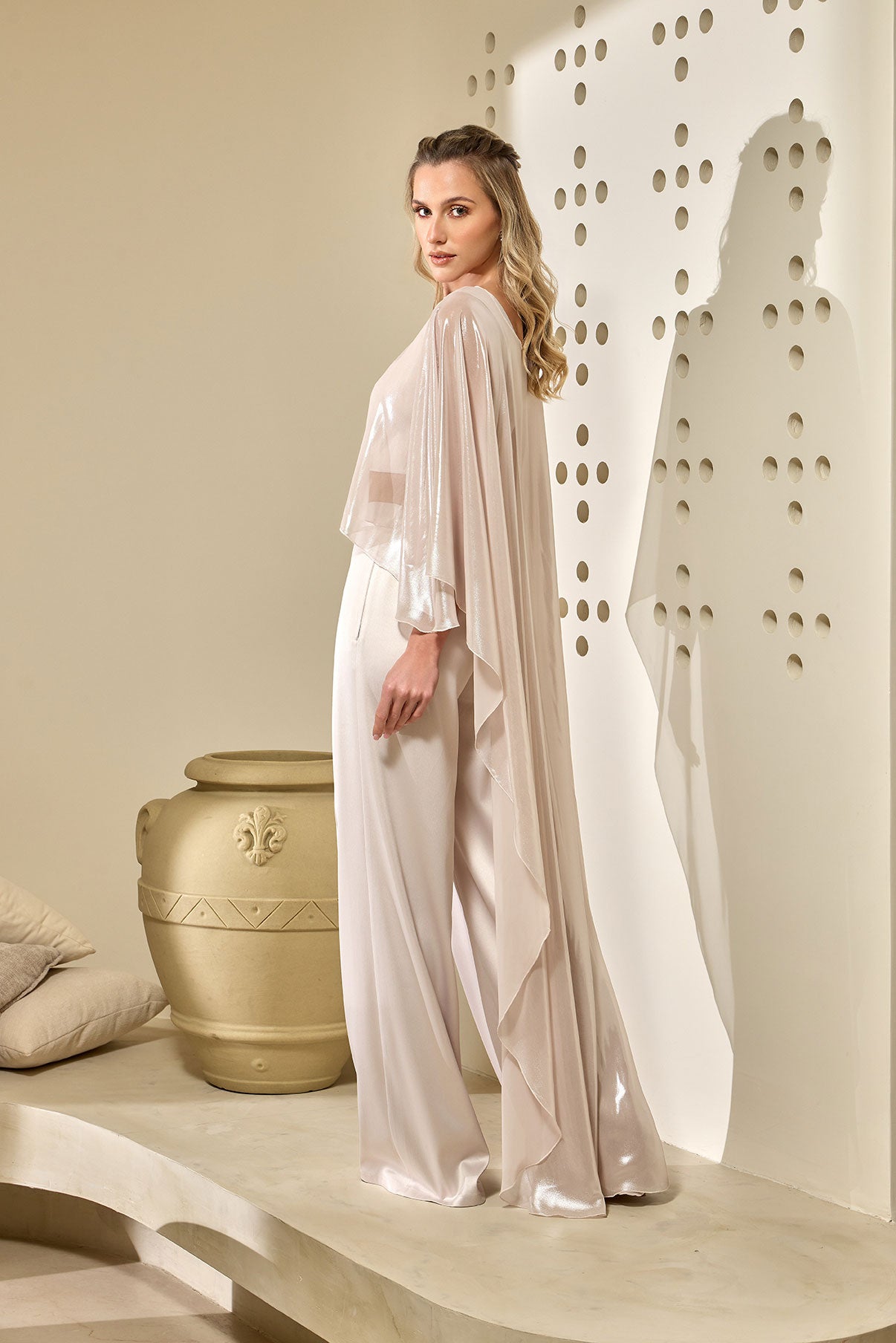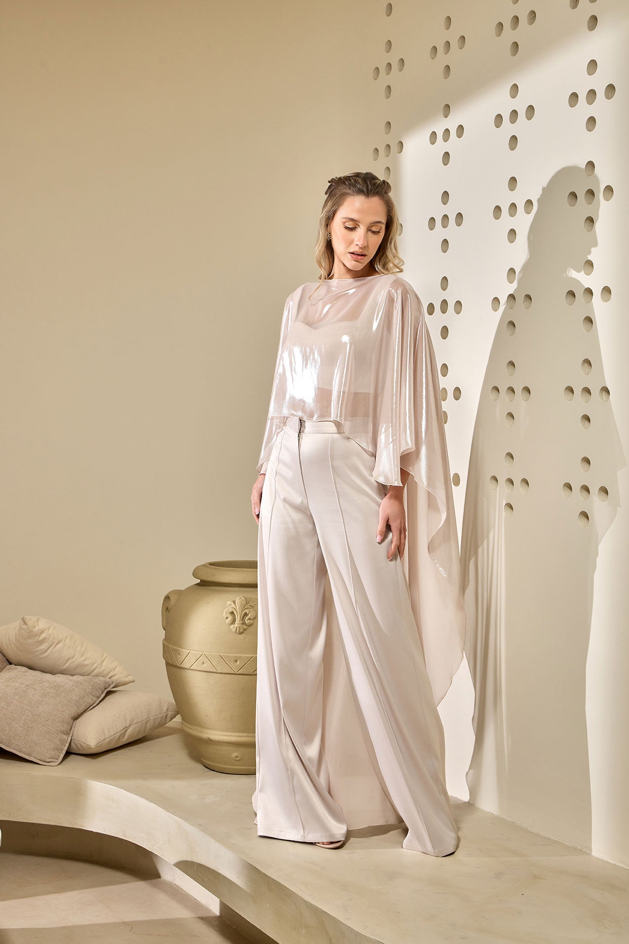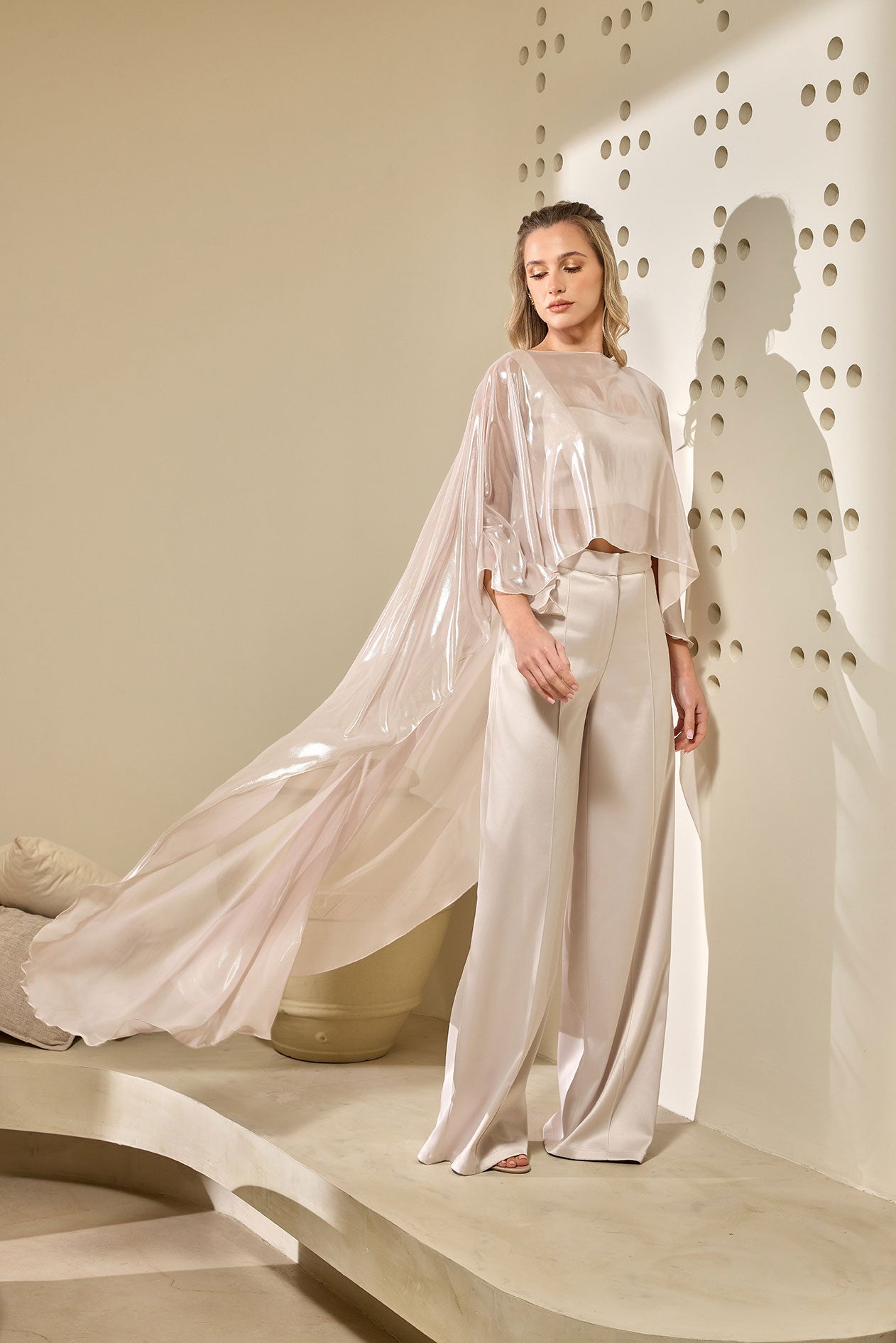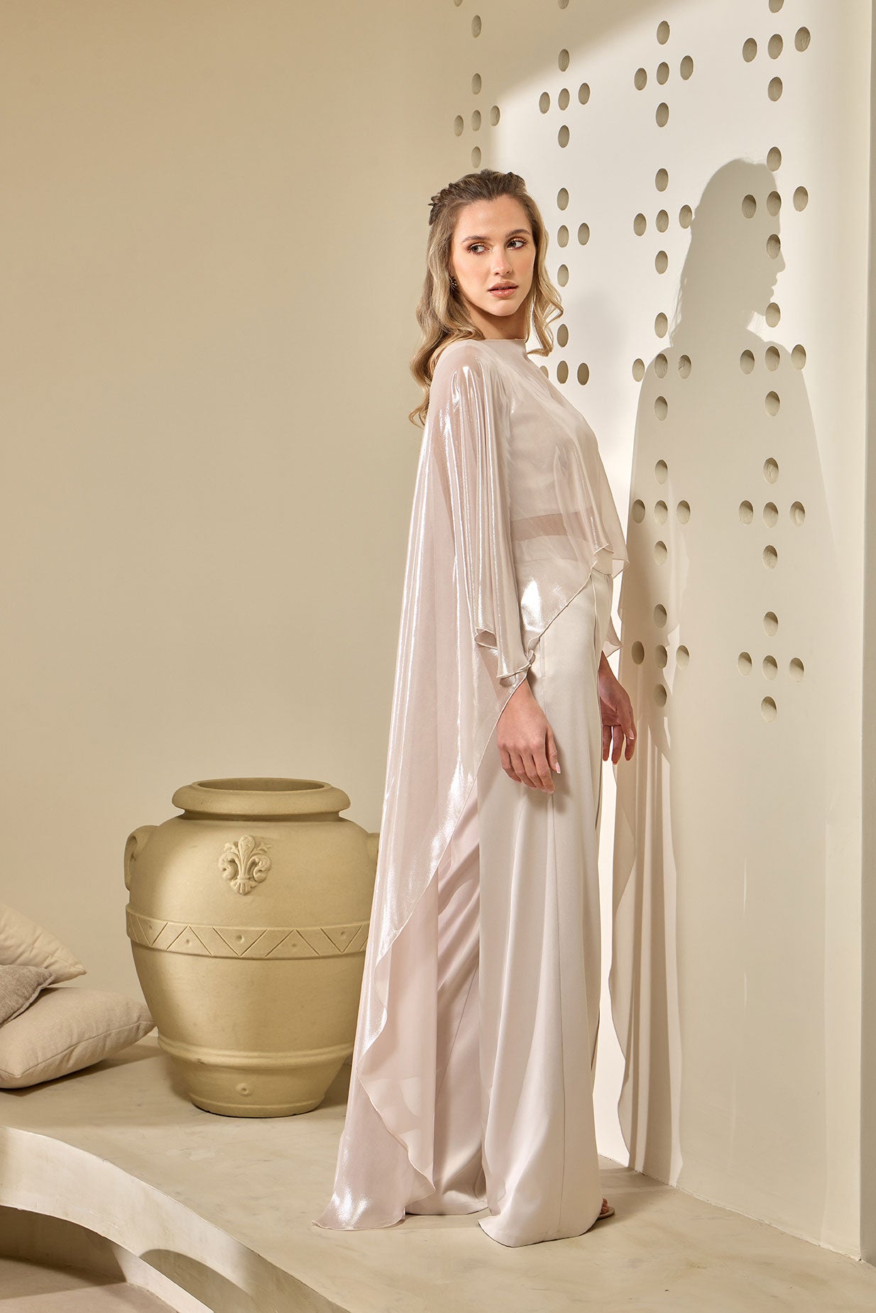 Ethereal and effortlessly refined, this Cape is designed to create a striking sense of movement and lightness. Crafted from a sheer, luminous fabric, it cascades gracefully from the shoulders into an elongated silhouette, catching the light with every step.