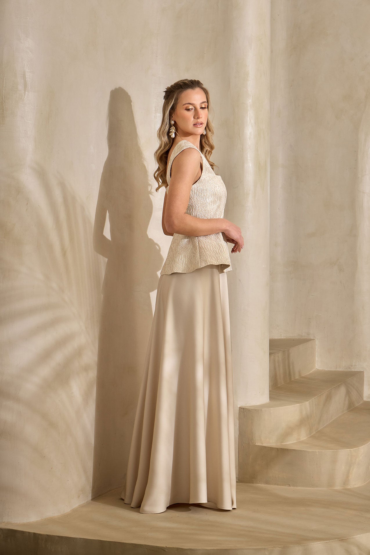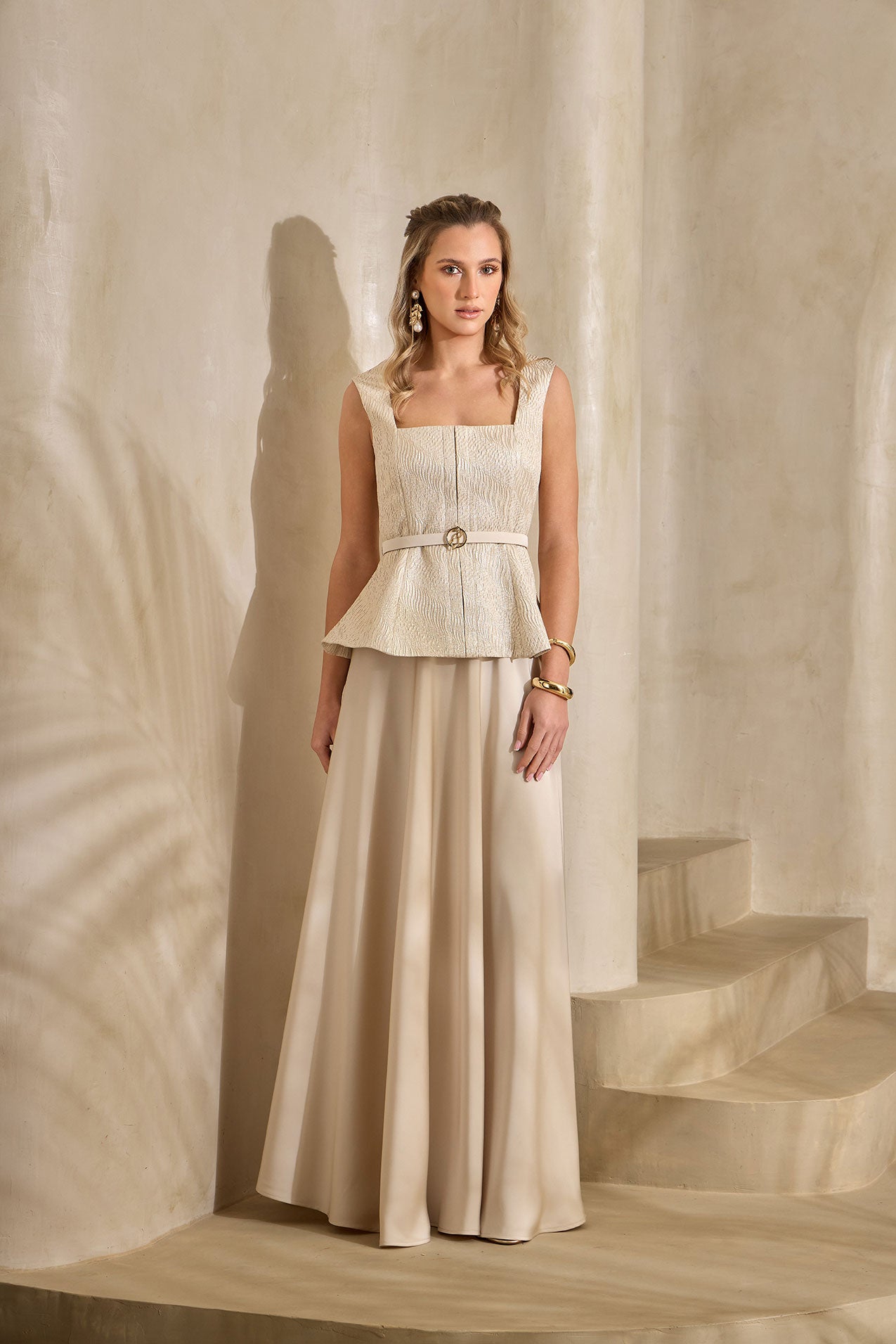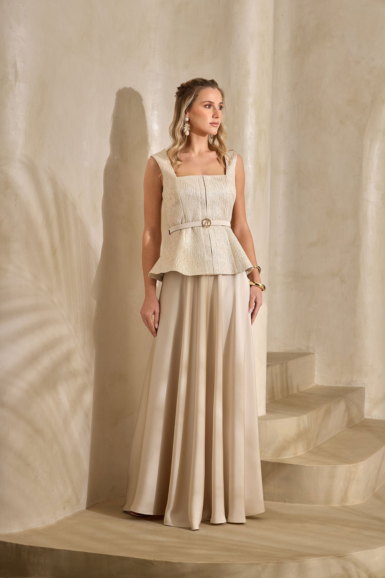 The Sirage Top is a refined blend of structure and softness, designed to elevate everyday elegance. Crafted in a textured golden fabric, it features a clean square neckline and a tailored bodice that gently contours the figure. A subtle peplum hem adds a feminine touch, while the delicate belt detail defines the waist with understated sophistication, making it a perfect piece for both polished daywear and elevated occasions.