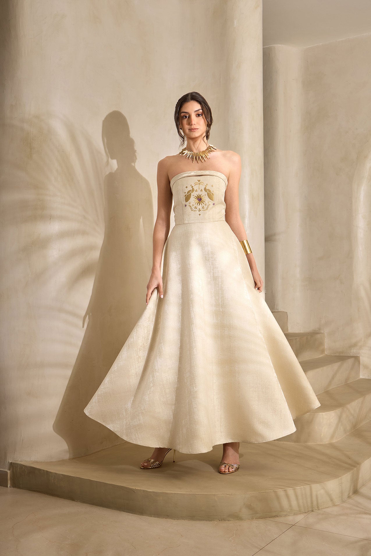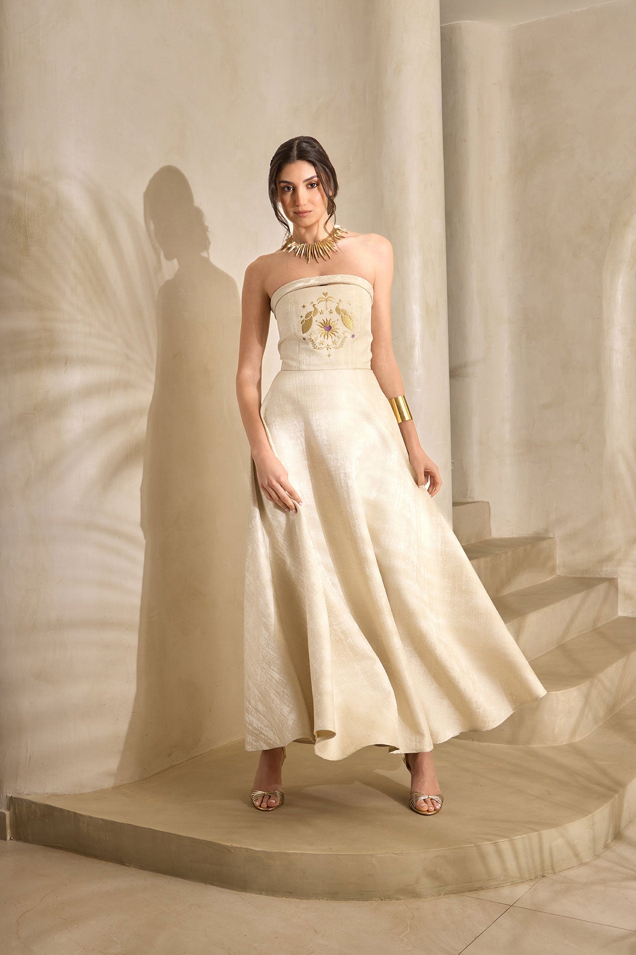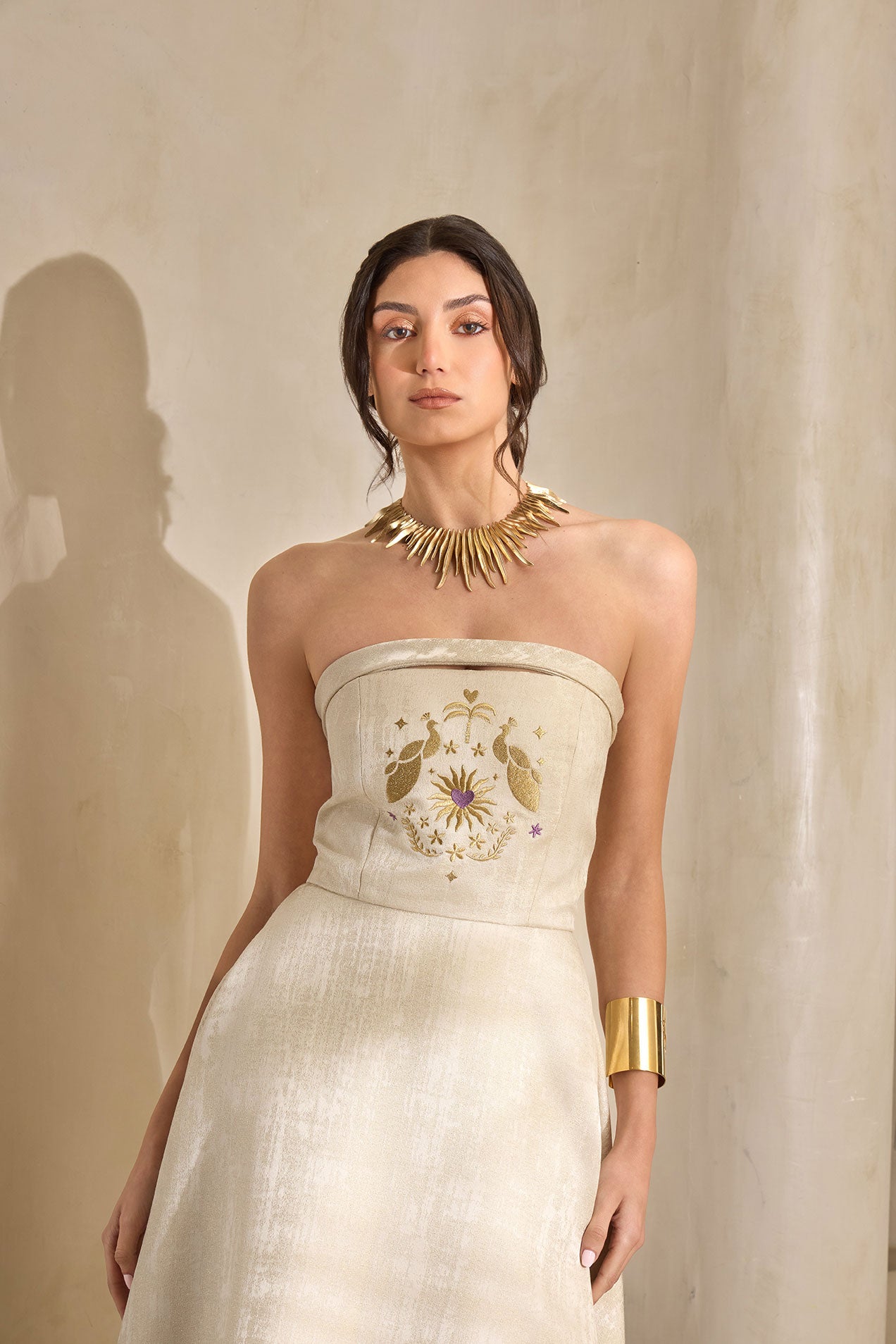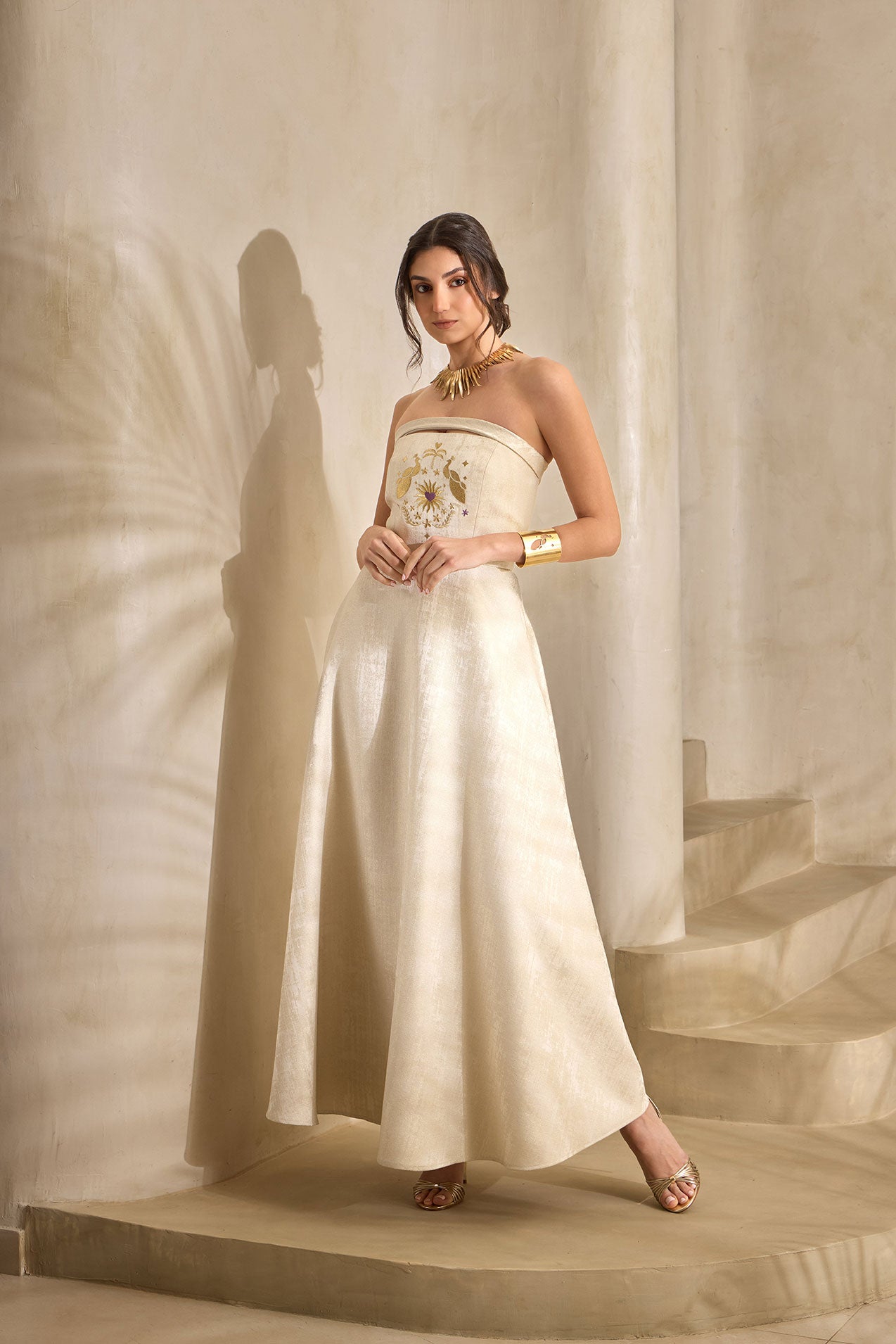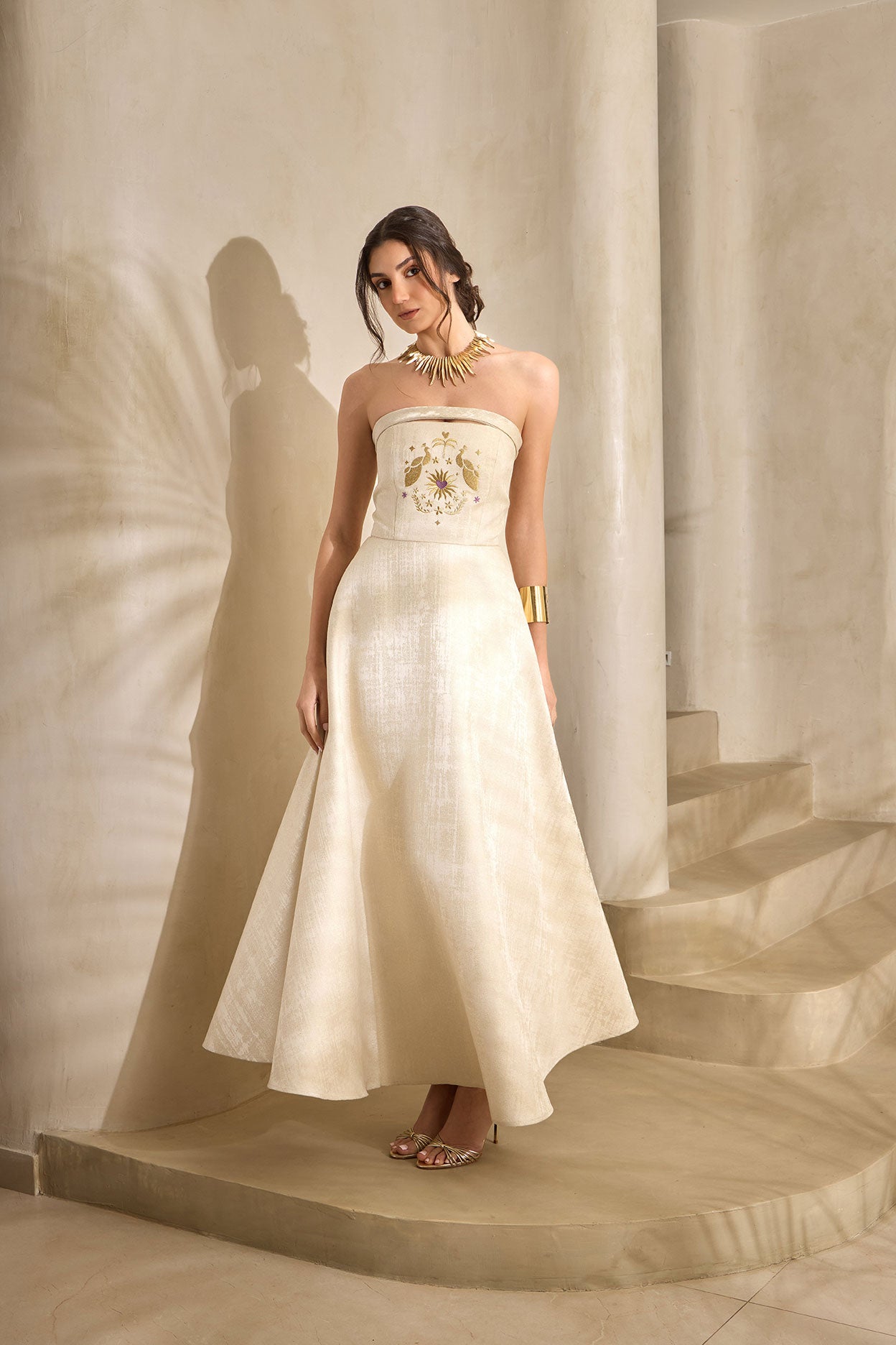 Elevate your elegance with the Soleil Embroidered Strapless Dress — a timeless piece designed for modern sophistication. Crafted in a soft golden hue, this dress features a structured strapless bodice adorned with delicate sun-inspired embroidery, creating a subtle yet striking focal point.