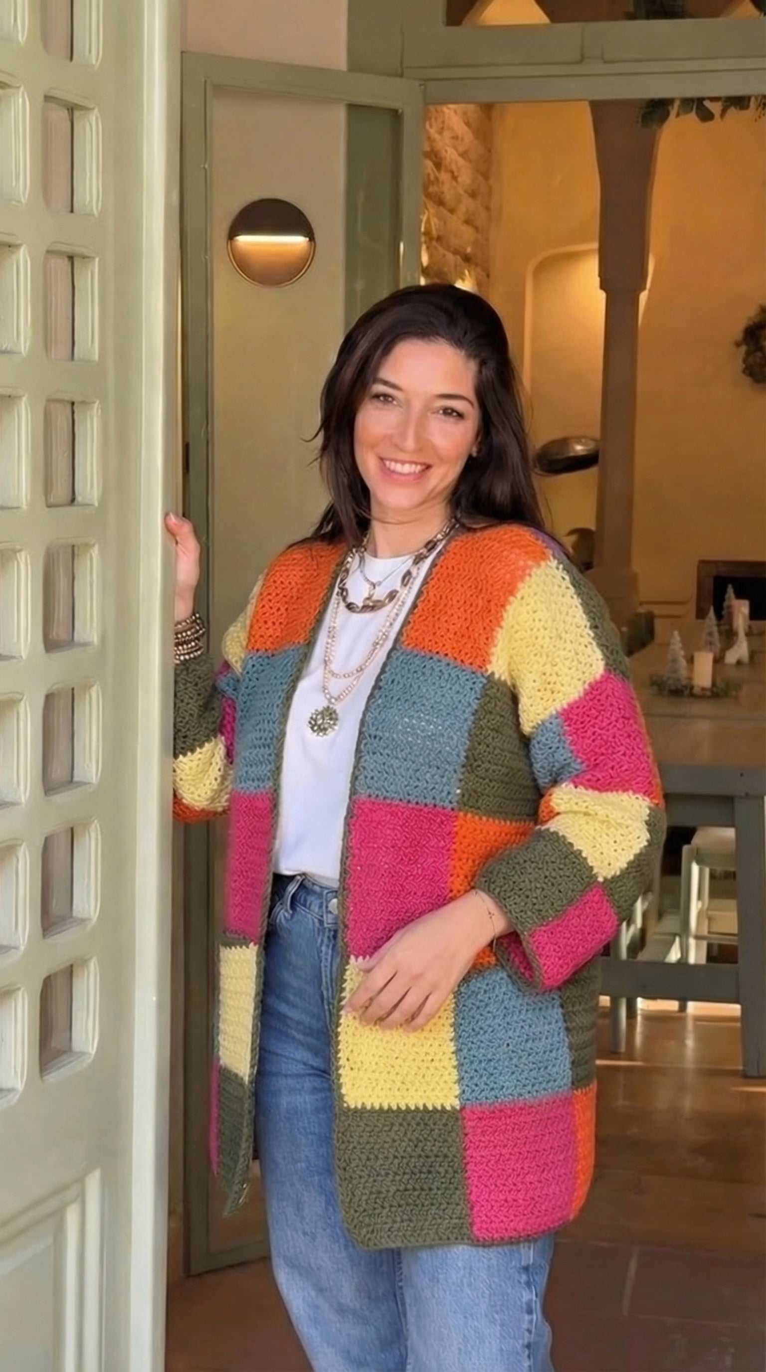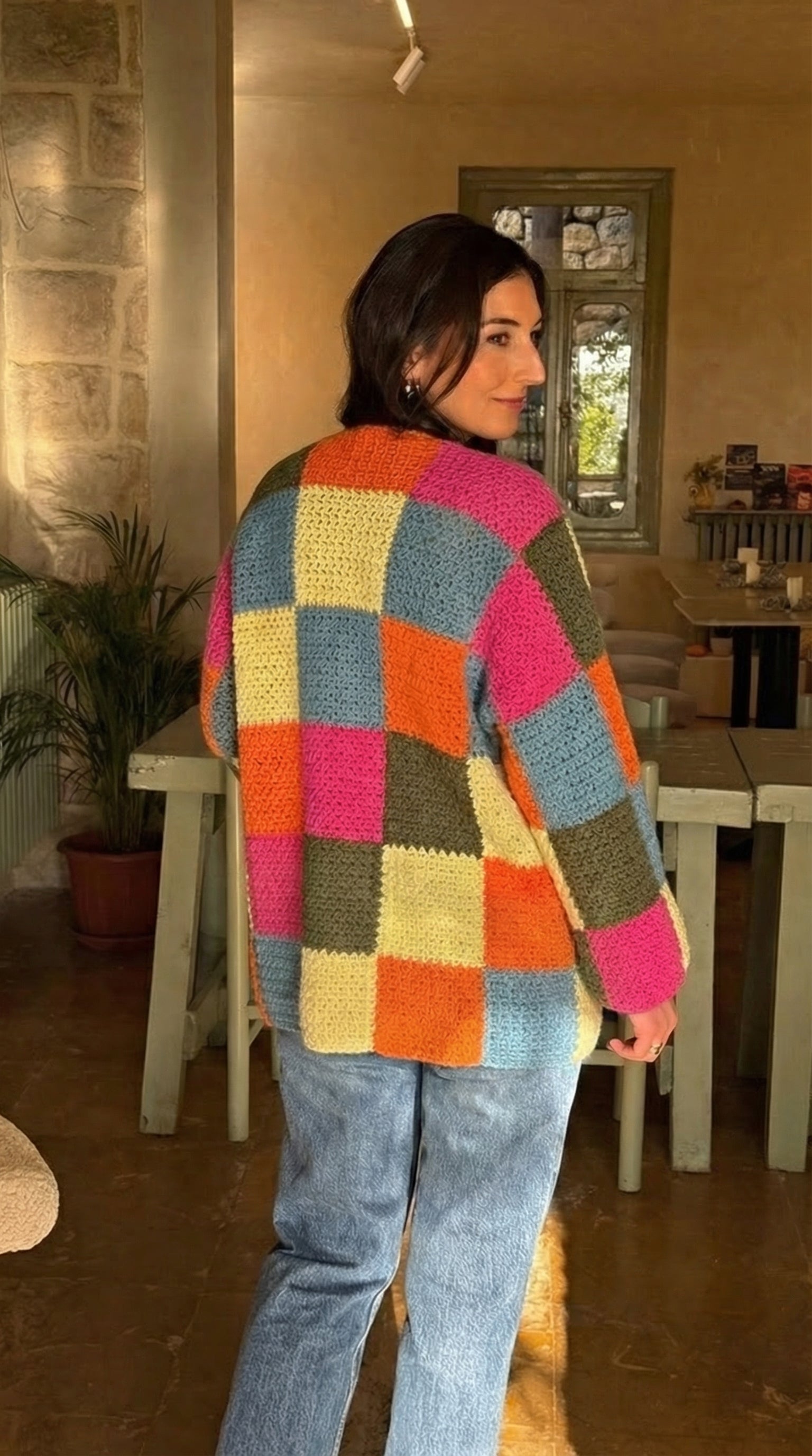 Each square brings a unique touch of artisanal charm, giving the cardigan a handcrafted feel while keeping it modern and versatile.