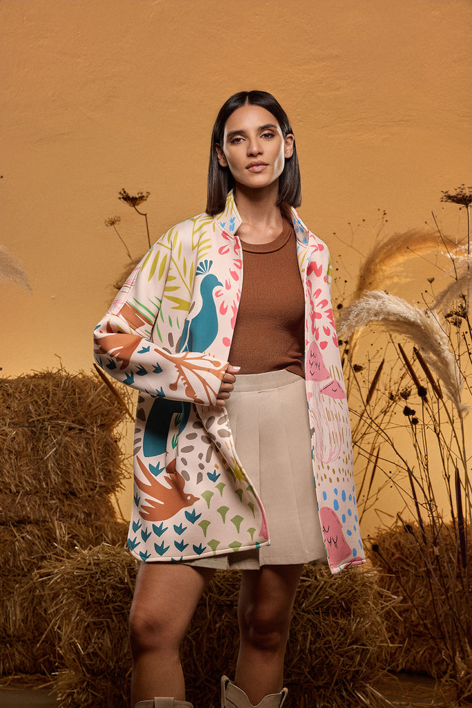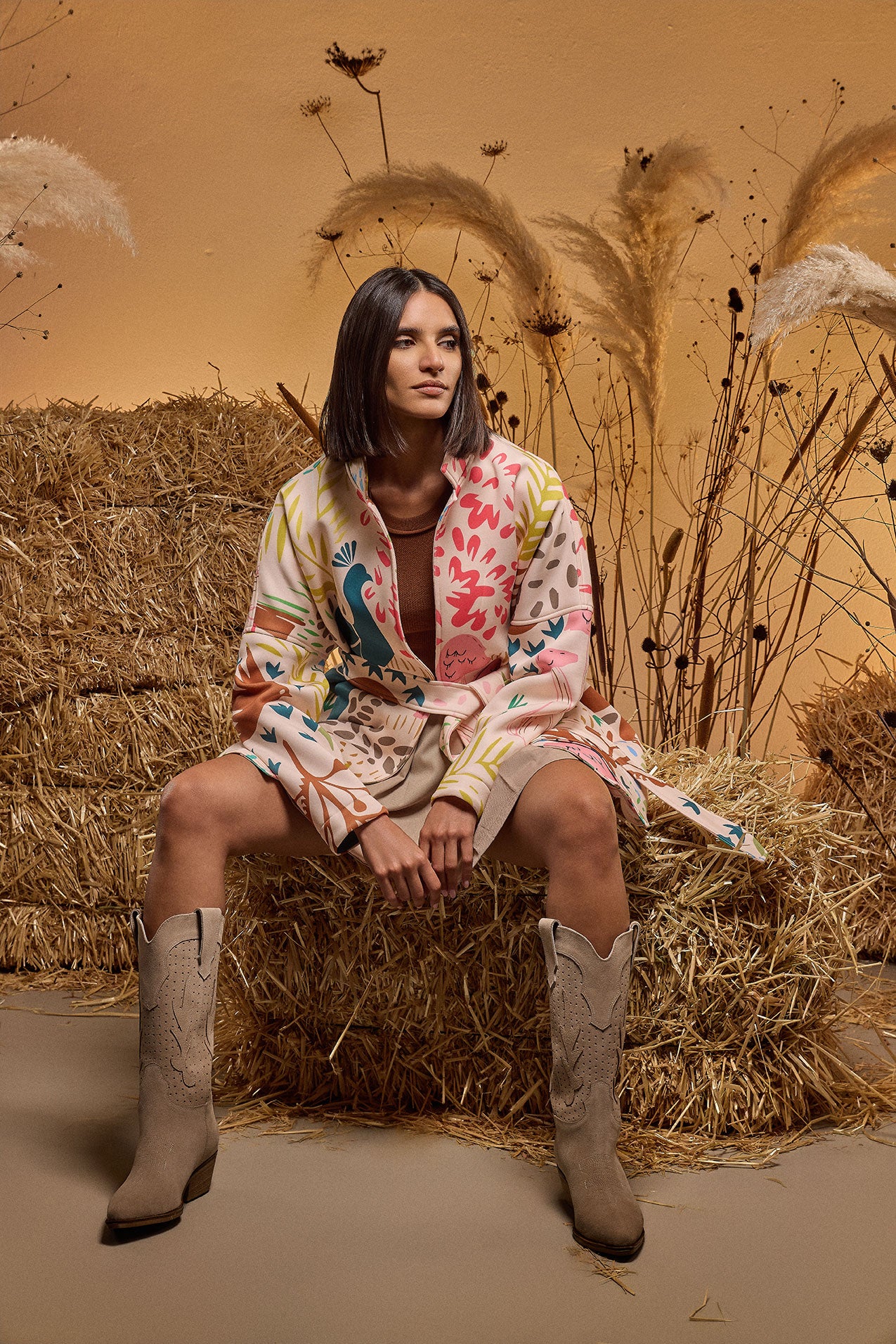 A vivid mirage of color and calm, the Oasis Jacket is a wearable daydream painted in strokes of whimsy. Its silky surface becomes a canvas of hand-drawn botanicals, dreamy fauna, and playful textures that feel plucked from an artist’s journal. Cinched gently at the waist with a matching belt, its structure is soft yet commanding — like a secret garden in bloom after rain.