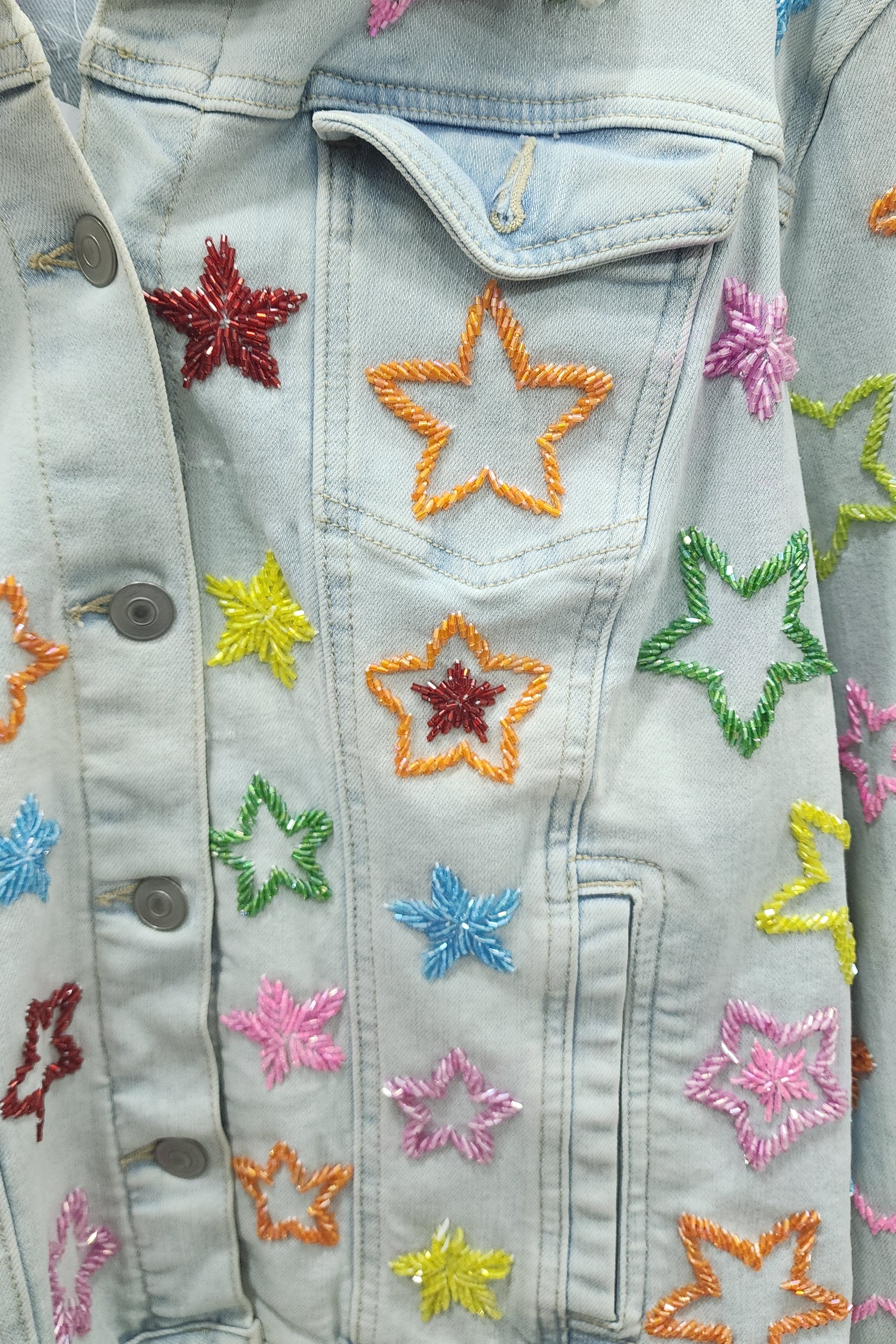 Add a little sparkle to your everyday style. The Star Jacket is a playful twist on a timeless classic, featuring vibrant multicolor star embroidery on a crisp blue denim base. Designed to stand out while staying effortlessly wearable, this jacket brings personality to any look.