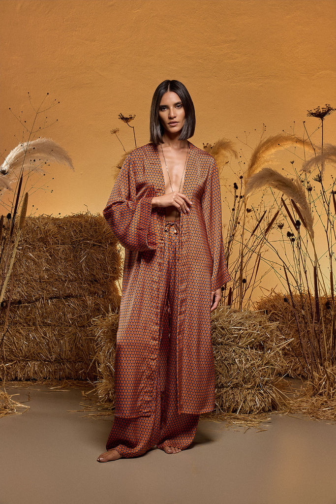 A poetic breeze stitched into silk, the Plume Kaftan is the embodiment of fluidity and freedom. Its feather-light drape flows like whispered lullabies over sun-kissed skin, adorned in a delicate geometric print that dances with the body’s every motion. The contrast trim gently outlines its shape — subtle yet striking — like a painter’s brush on a serene canvas.