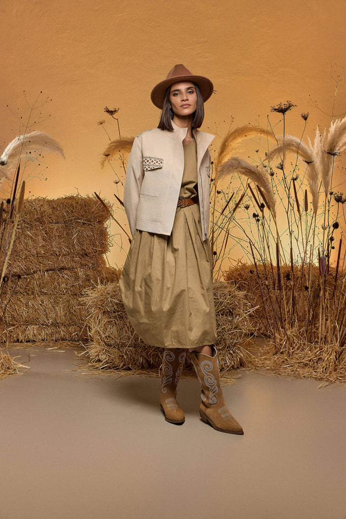 Design Features: Relaxed balloon-style skirt, sleeveless cut, high round neckline, midi length with hidden pockets