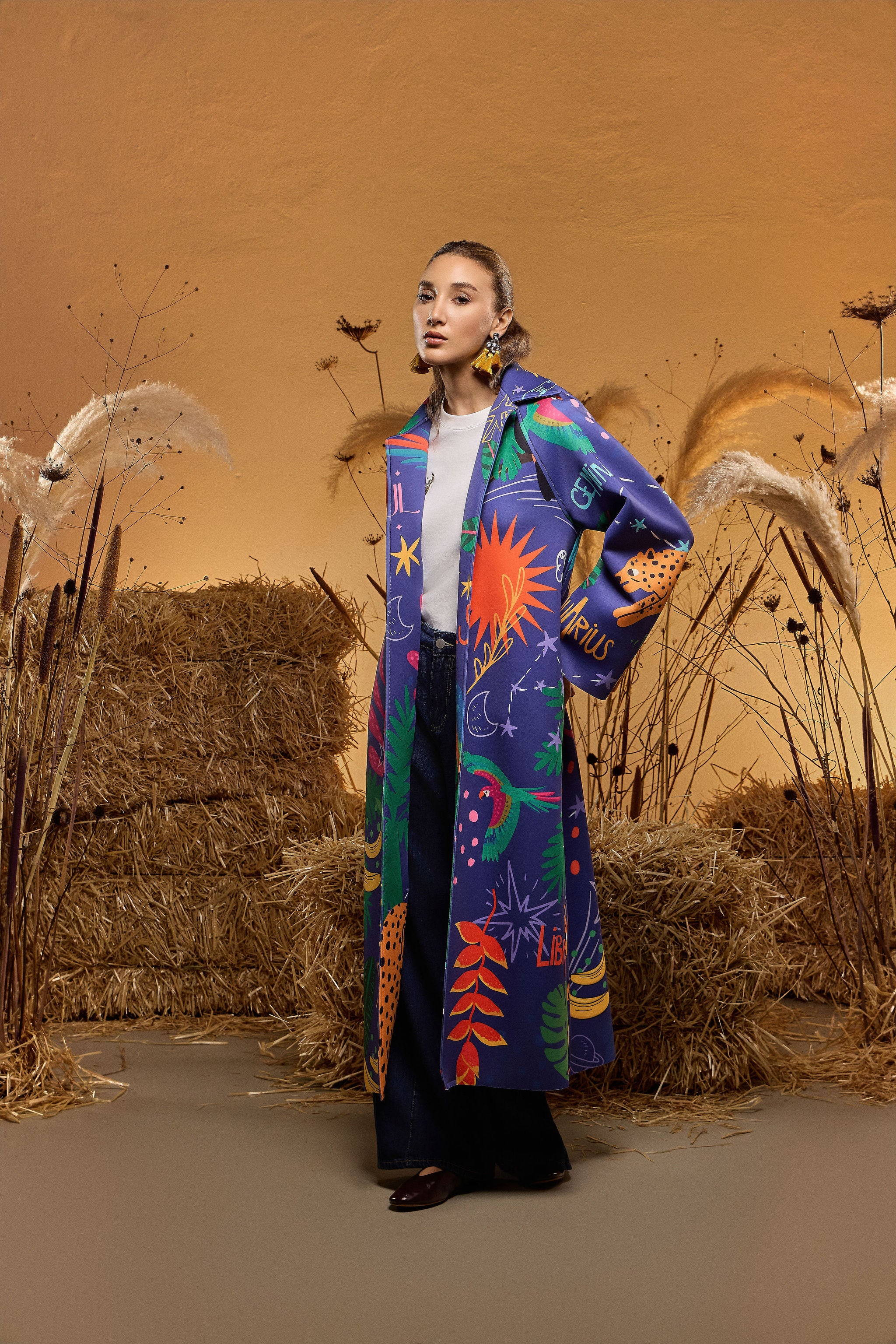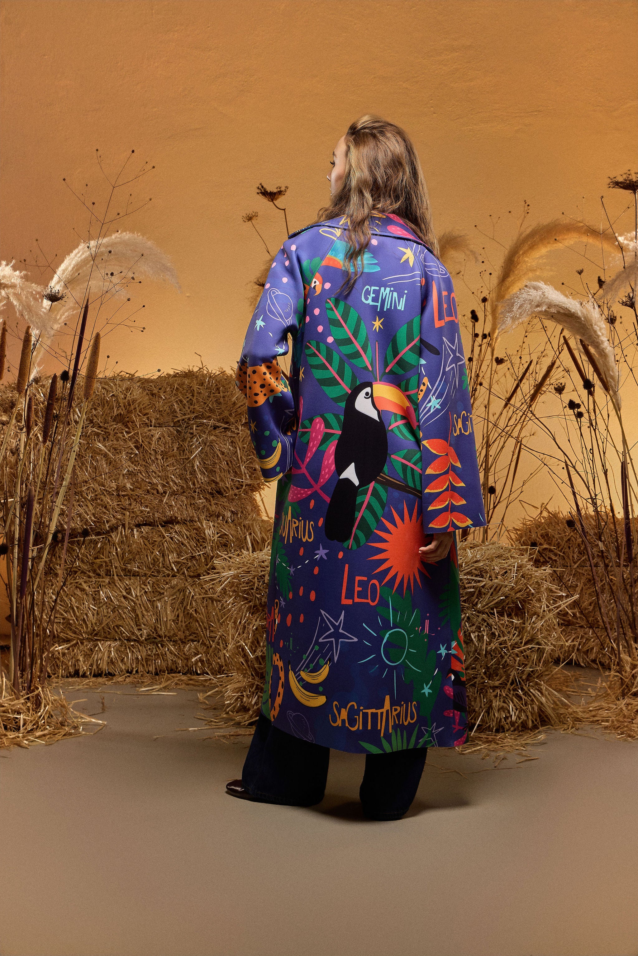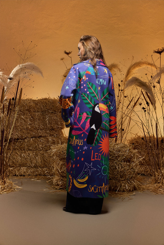 Introducing our Toucan Coat, a unique blend of style and art, crafted from durable scuba fabric. This coat features a classic straight-cut collar, providing a timeless and sophisticated look for various occasions.